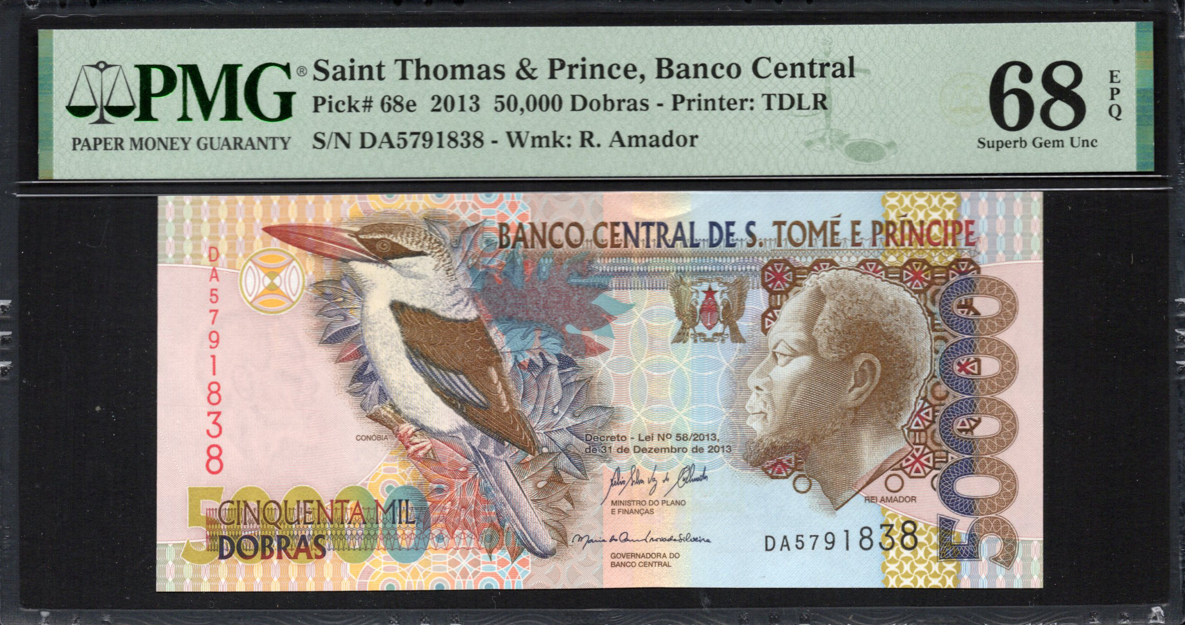 Ce billet exquis de São Tomé et Príncipe présente des dessins complexes et des couleurs vives, reflétant la riche héritage culturel du pays. L'avers montre un magnifique martin-pêcheur, symbole de la faune diversifiée de la région. Le revers du billet présente des figures et des symboles nationaux significatifs, créant une narration qui raconte l'histoire du pays. Avec divers éléments de sécurité tels que des filigranes et du microtexte, ce billet sert non seulement de monnaie, mais aussi de toile d'expression artistique.