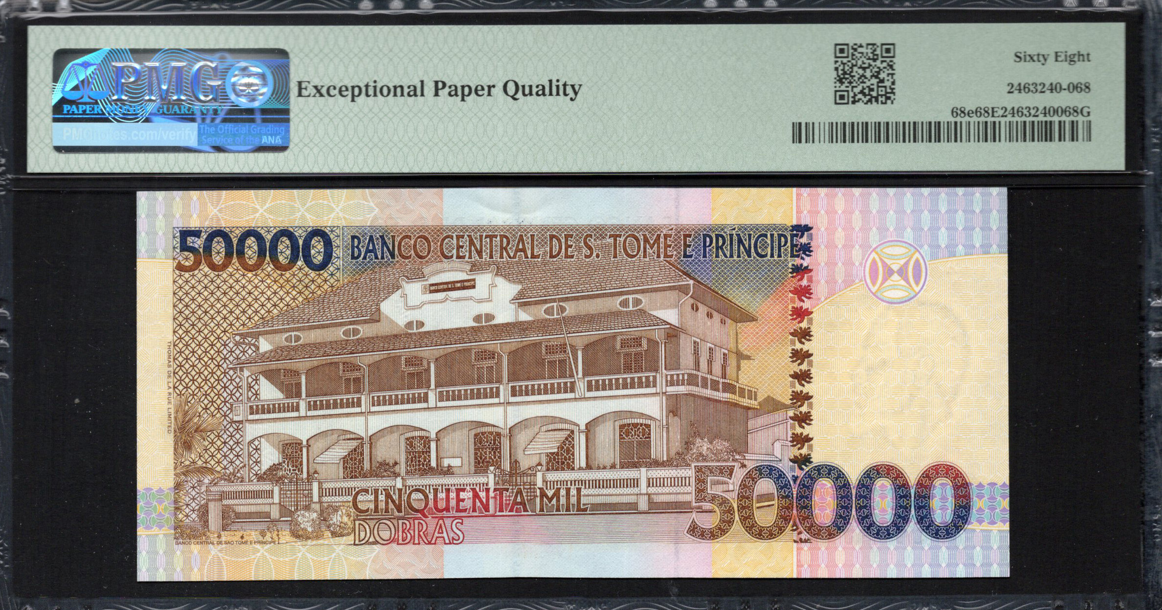L'avers du billet de 50.000 Dobras met en avant une représentation frappante d'un martin-pêcheur, un oiseau natif de São Tomé et Príncipe, offrant une représentation vive de la faune de l'île. L'arrière-plan est une mosaïque de motifs géométriques et de couleurs pastel, augmentant l'attrait esthétique. Les éléments de sécurité incluent un filigrane visible à la lumière et un design de fenêtre transparente, ajoutant des couches de protection contre la contrefaçon. Le texte est imprimé en lettres claires et en gras, indiquant la dénomination et la banque émettrice, renforçant l'authenticité du billet.