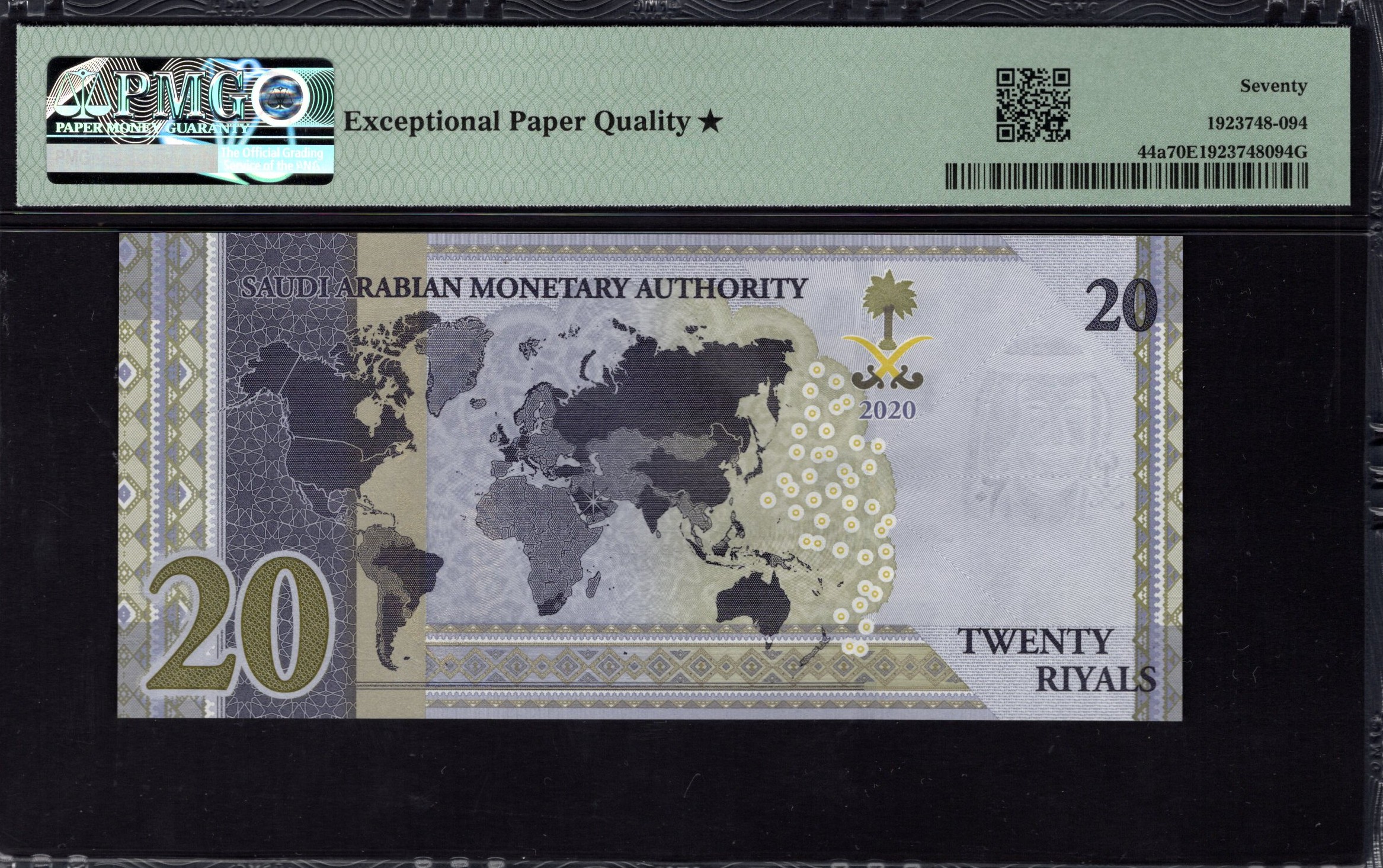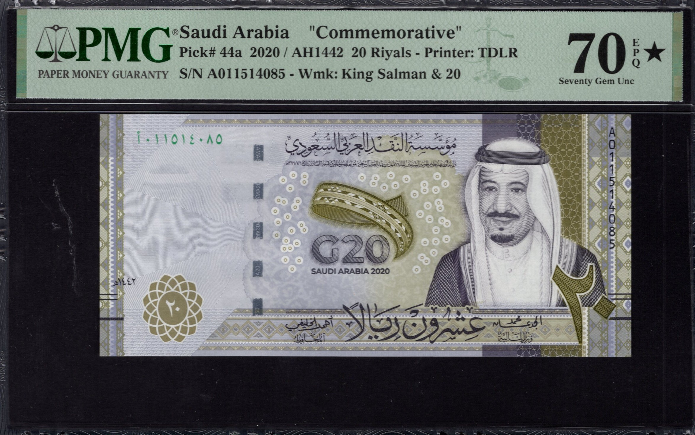 Le recto du billet de 20 riyals présente en évidence un portrait du roi Salman, montrant sa tenue royale. Autour du portrait, des motifs décoratifs comprennent une combinaison de formes géométriques et de motifs organiques, principalement dans des tons de vert et d'or. Des caractéristiques de sécurité significatives comme un filigrane de l'image du roi et une fenêtre transparente améliorent son authenticité. La dénomination '20' est affichée en évidence, accompagnée du texte 'Saudi Arabia 2020', indiquant son année d'émission.