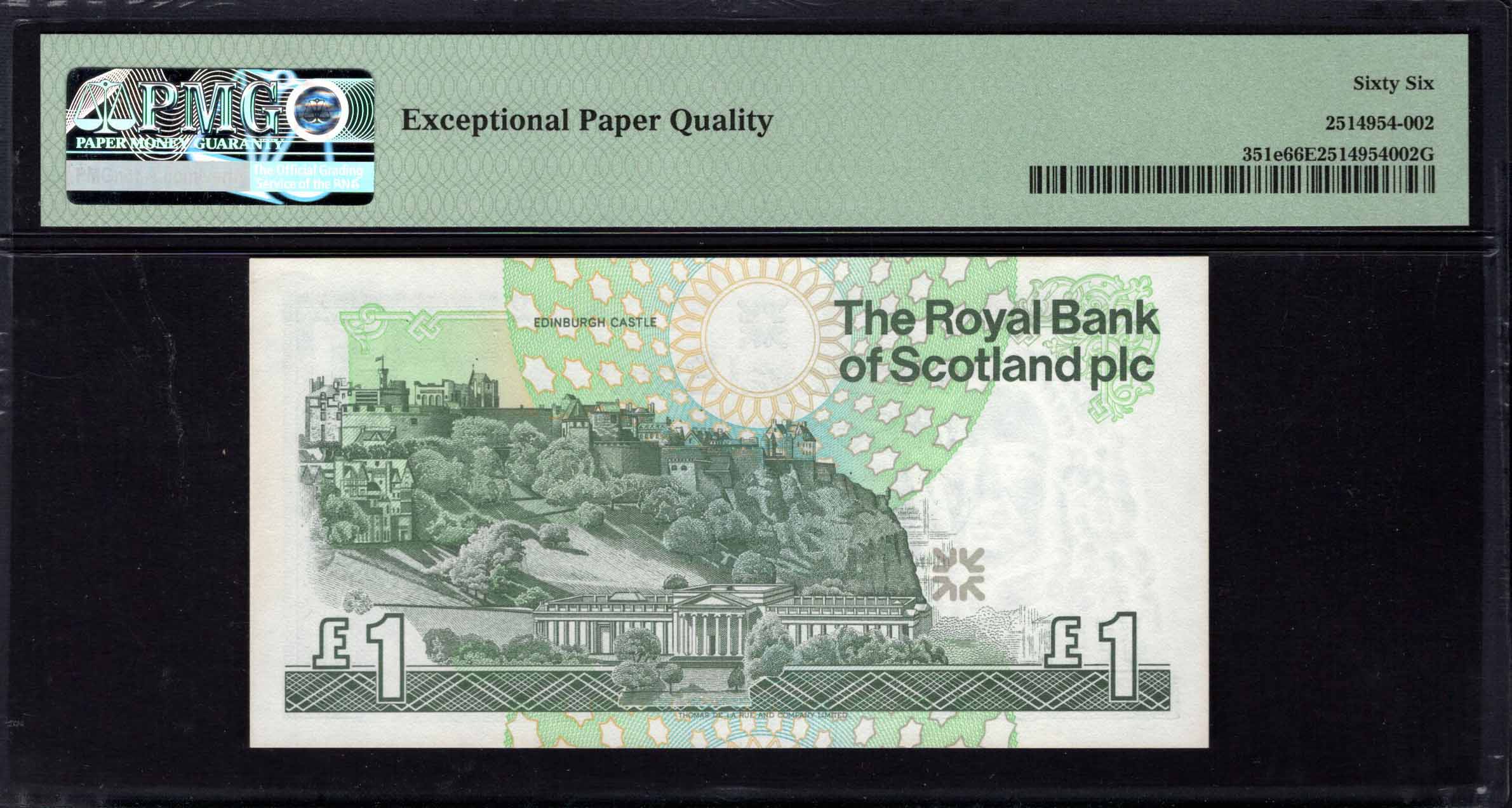 La revers du billet de £1 comporte divers éléments décoratifs complexes, bien que des images spécifiques soient moins proéminentes que sur le recto. Les motifs et les conceptions reflètent le patrimoine écossais, imprégnés de symbolisme qui lie le billet à son contexte culturel. L'arrière-plan peut afficher un motif géométrique répétitif, ajoutant de l'intérêt visuel tout en maintenant des mesures de sécurité. Comme sur le recto, le verso contient un texte essentiel, renforçant la légitimité du billet. L'équilibre soigneusement élaboré entre les détails artistiques et les principes de conception fonctionnelle illustre l'engagement à produire une monnaie sécurisée mais visuellement attrayante.
