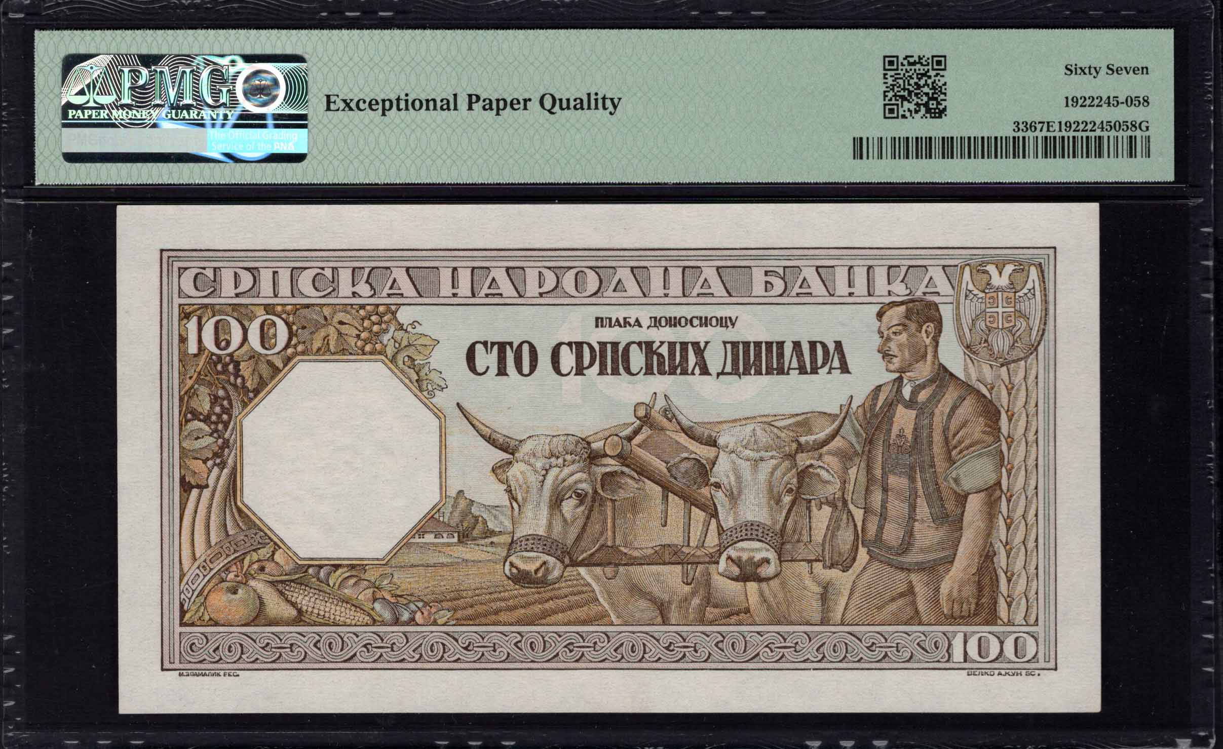 Le recto du billet de 100 Dinar est dominé par le portrait d'un homme distingué, probablement une figure historique ou culturelle reconnue dans l'histoire serbe. Le portrait est entouré de bordures soigneusement conçues avec des éléments ornementaux, probablement réalisés dans des tons terreux doux qui évoquent les styles artistiques de l'époque. Le montant '100' est clairement affiché dans chaque coin, ajoutant à son impact visuel. Des éléments de sécurité notables peuvent inclure un filigrane subtil, témoignant du raffinement du design monétaire durant la Seconde Guerre mondiale. La composition globale équilibre la signification historique avec un flair artistique, capturant efficacement la période.