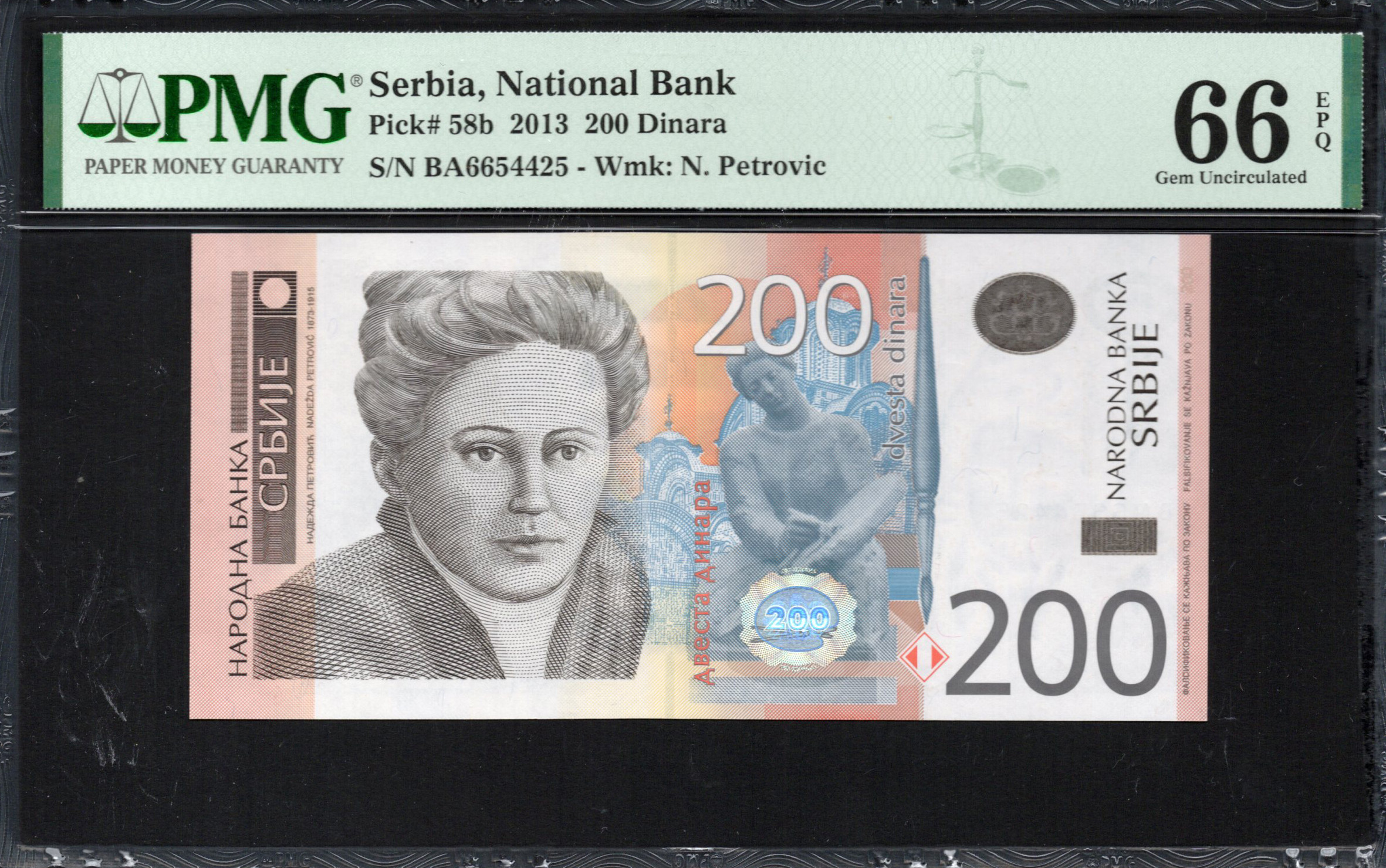 Le recto du billet de 200 dinars présente le portrait d'un auteur serbe notable, entouré de motifs délicats. L'utilisation de teintes pêche et brun clair donne au billet une esthétique chaleureuse. Les caractéristiques notables incluent un travail de ligne complexe et une fenêtre partiellement transparente affichant un fil de sécurité, ajoutant de la profondeur et de la complexité. La zone inférieure présente la dénomination en caractères gras, accompagnée de détails d'impression microscopiques difficiles à voir à l'œil nu, renforçant ainsi la sécurité.