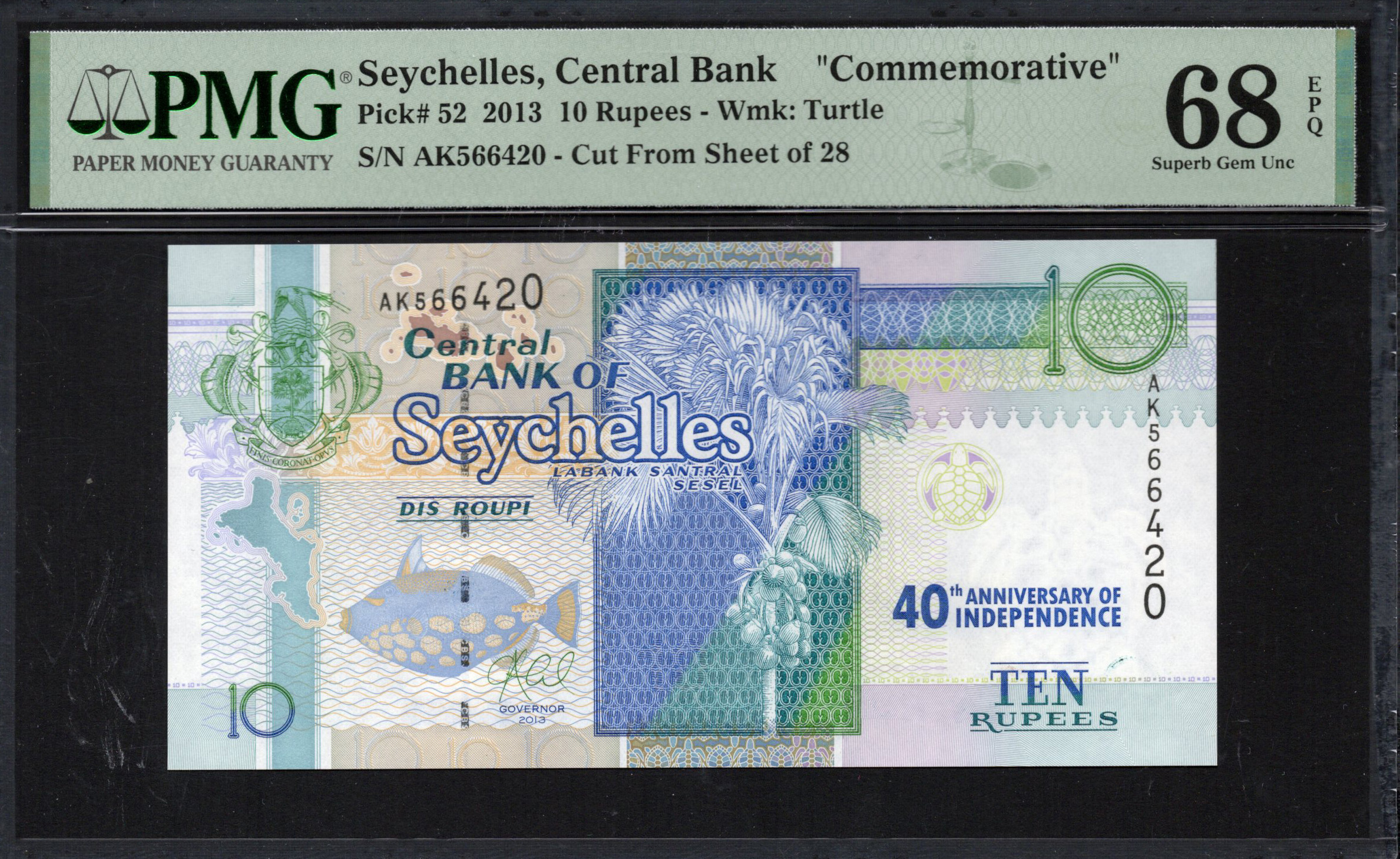 Le billet de 10 Roupies de la Banque Centrale des Seychelles, émis en 2013 comme pièce commémorative, présente des œuvres d'art magnifiques et des caractéristiques de sécurité complexes. Dominé par des nuances de bleu et de vert, le billet arbore un grand emblème de tortue, symbolisant la vie marine de la région. Les éléments artistiques notables incluent des palmiers et un motif stylisé de poisson, augmentant son attrait esthétique. Ce billet symbolise la richesse de la beauté naturelle et du patrimoine des Seychelles.