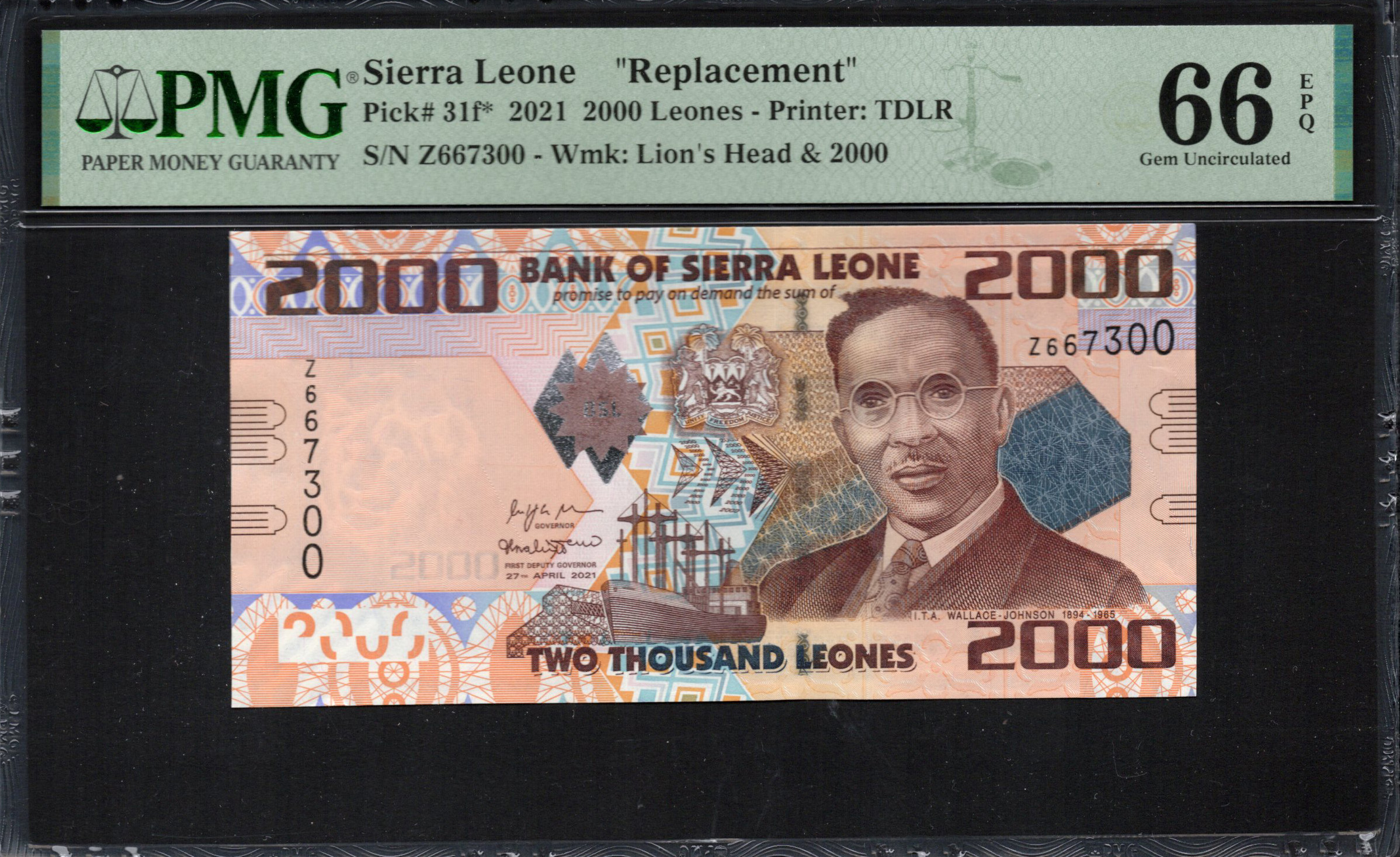L'avant du billet de 2000 Leones met en avant un portrait marquant d'I.T.A. Wallace Johnson, une figure importante de l'histoire de la Sierra Leone. Ses lunettes et son expression confiante ajoutent une certaine autorité au billet. L'arrière-plan présente un éventail de motifs géométriques dans des teintes d'orange et de bleu, combinant créativité artistique et motifs culturels. Les caractéristiques de sécurité comprennent un filigrane en forme de tête de lion et du microtexte courant le long des bords, garantissant l'authenticité tout en améliorant la complexité visuelle. La dénomination '2000' est clairement affichée en caractères gras, soulignant sa valeur.