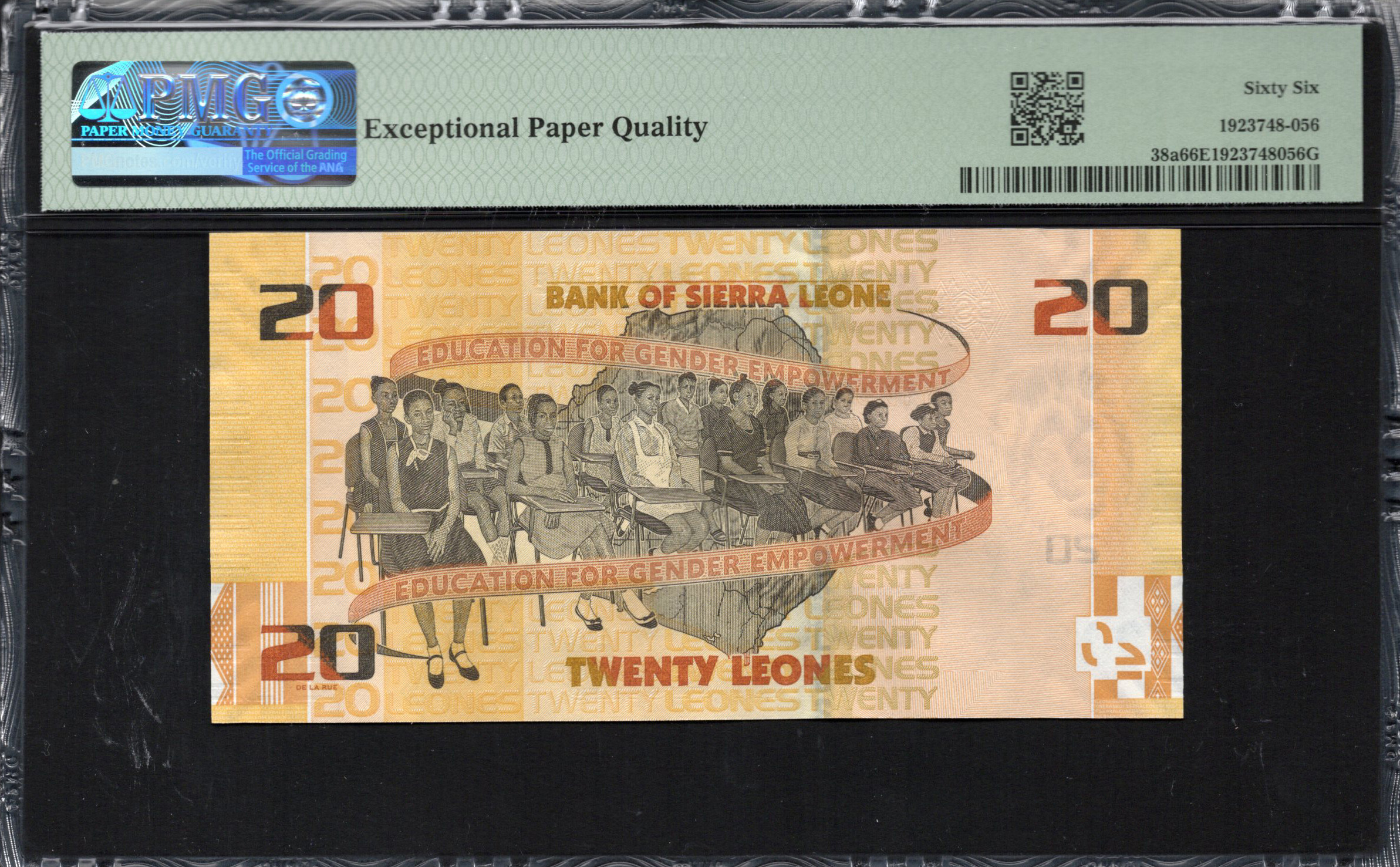 Au verso du billet de 20 Leones, on trouve des conceptions élaborées qui reflètent la culture sierra-léonaise. Au centre se trouve l'emblème du lion, un symbole national important. L'arrière-plan est orné d'une variété de motifs géométriques dans des teintes jaunes et oranges, créant un effet visuel frappant. La dénomination '20' est affichée à plusieurs endroits, garantissant sa visibilité. Des caractéristiques de sécurité clés telles que des bandes holographiques peuvent être présentes dans le design. La présentation globale souligne la valeur du billet tout en célébrant le riche héritage artistique de la Sierra Leone, le rendant à la fois fonctionnel et visuellement captivant.