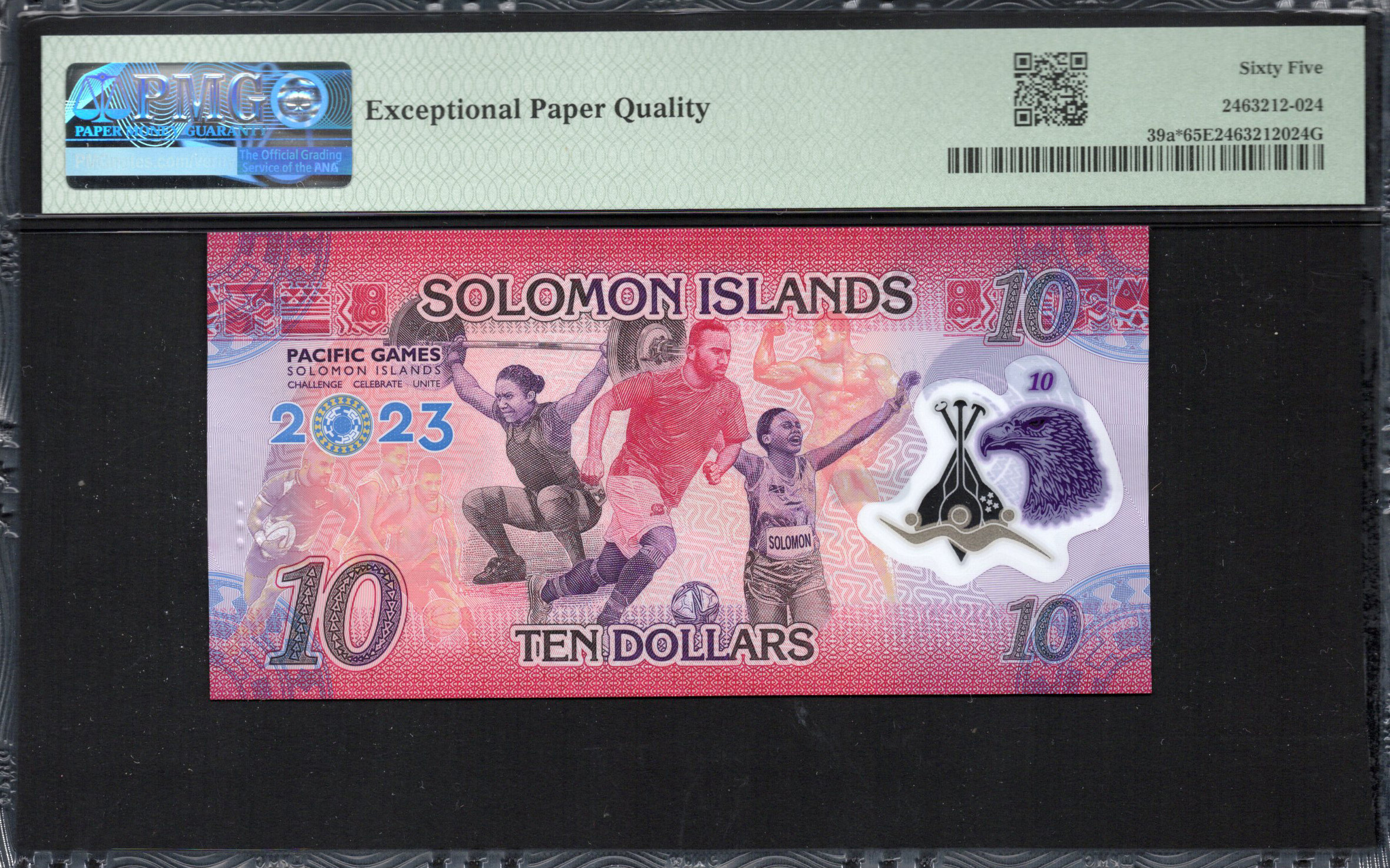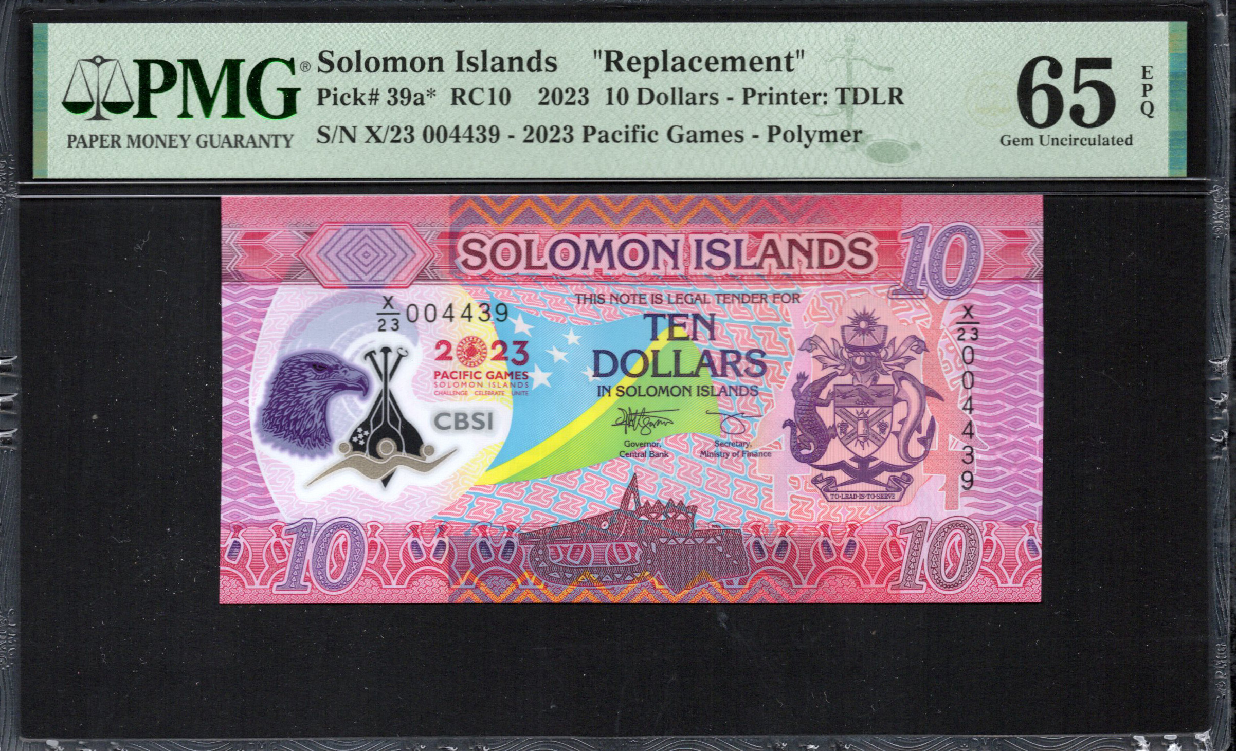 Le billet de dix dollars des Îles Salomon de 2023 affiche des couleurs vives et des motifs complexes reflétant le patrimoine culturel de la région. Avec son matériau en polymère, ce billet offre non seulement durabilité mais également des éléments de sécurité avancés. Sur le recto, des illustrations vives symbolisent les Jeux du Pacifique, accompagnées de symboles significatifs uniques au pays. Ce billet sert non seulement de moyen d'échange mais aussi de témoignage de la riche histoire et de l'expression artistique des Îles Salomon.
