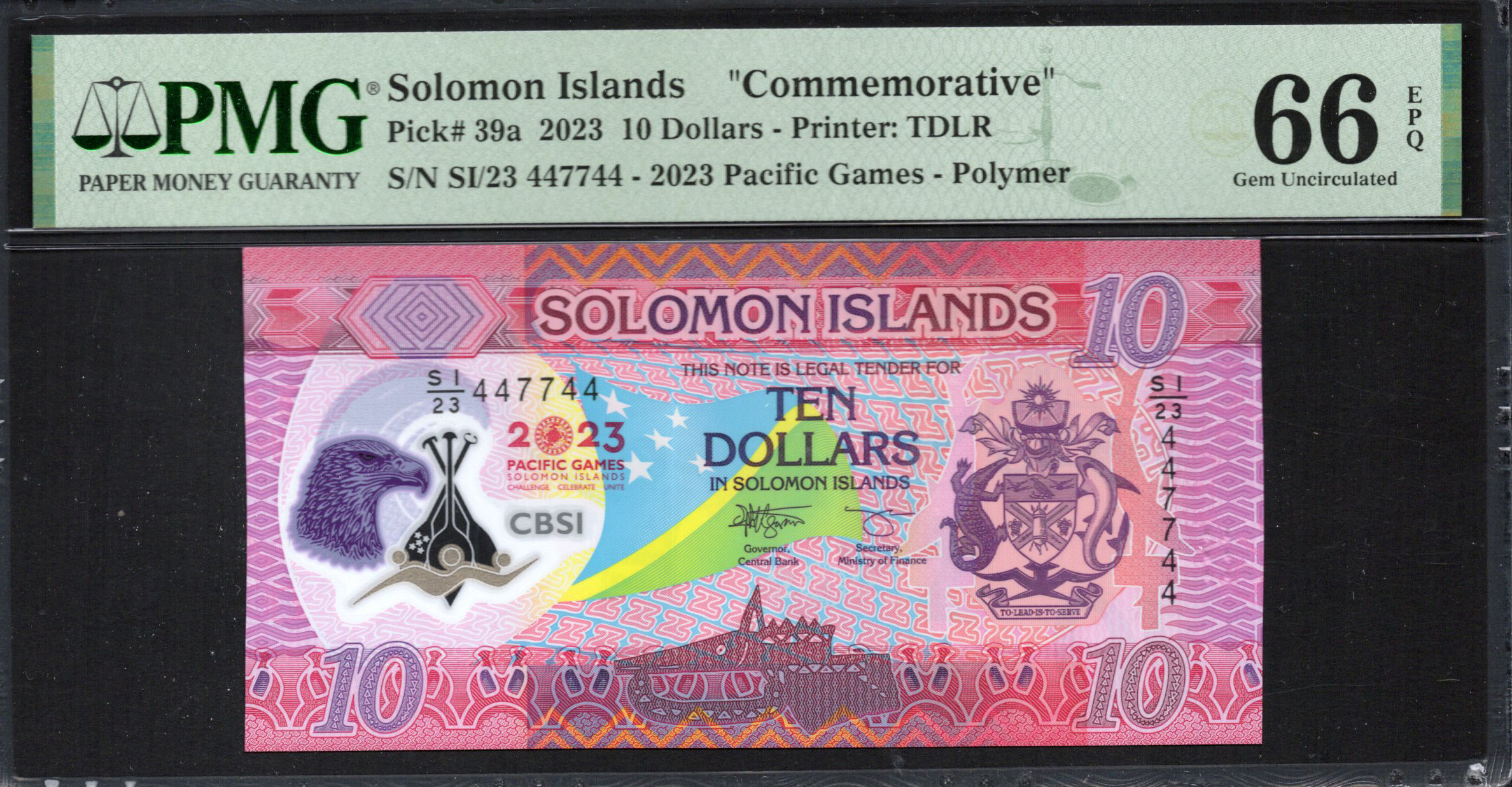 Le billet de 10 dollars des Îles Salomon, émis en 2023, se distingue par ses couleurs vibrantes et ses éléments artistiques uniques célébrant les Jeux du Pacifique. En tant que monnaie légale, il reflète le riche patrimoine culturel des Îles Salomon, offrant un aperçu de son histoire et de l'identité de sa communauté.