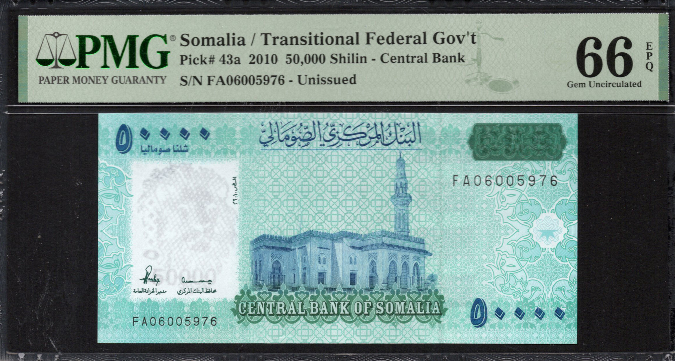 Ce billet de banque du Somali, émis en 2010, fait partie de la monnaie du Gouvernement fédéral de transition. Dénominé à 50 000 Shilin, il présente des designs complexes qui reflètent la culture et l'architecture somaliennes. Le billet arbore des couleurs vives, principalement dans des nuances de vert, symbolisant la prospérité. Son état non circulé, marqué comme 'Gem Uncirculated' par PMG, indique qu'il est en parfait état et conserve toutes ses caractéristiques d'origine, ce qui en fait un objet de collection précieux.