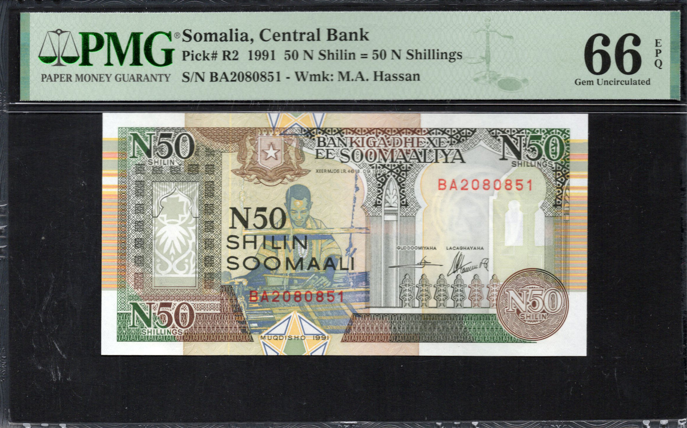 Le recto du billet de 50 shillings somaliens présente de manière proéminente une figure assise engagée dans une performance musicale, reflétant l'importance de la musique dans la culture somalienne. Autour de cette figure, des motifs ornés et une représentation de l'emblème national sont visibles. Les valeurs en mots et en chiffres ('N50 SHILIN') se distinguent, renforçant la valeur du billet. Des caractéristiques de sécurité telles que du microtexte et un filigrane peuvent être aperçues lors d'un examen attentif, assurant l'intégrité du billet. La palette de couleurs mélange des teintes terreuses avec des verts vifs, créant une expérience visuellement riche.