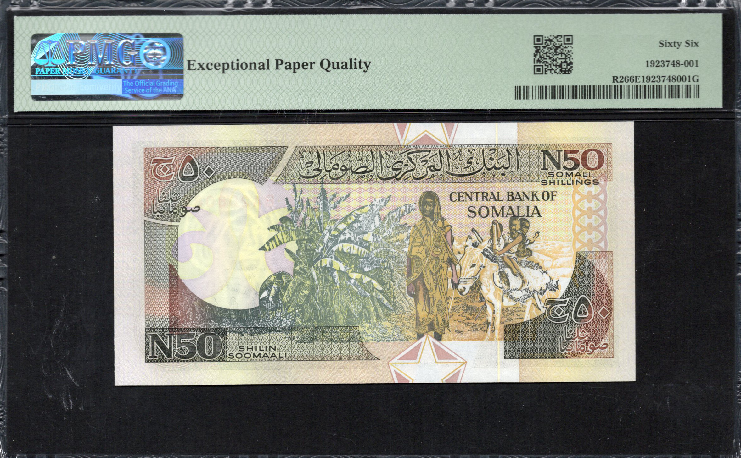 Ce billet, d'une valeur de 50 shillings somaliens, présente un design vibrant et complexe représentant le patrimoine culturel de la Somalie. Le recto affiche une représentation détaillée d'un homme assis jouant d'un instrument de musique traditionnel, sur fond d'un motif géométrique élaboré qui souligne l'artisanat somalien. De plus, le billet utilise diverses caractéristiques de sécurité telles qu'un filigrane et une micro-impression pour garantir son authenticité. Les couleurs, notamment des nuances de vert, d'orange et de beige, offrent un attrait esthétique frappant.