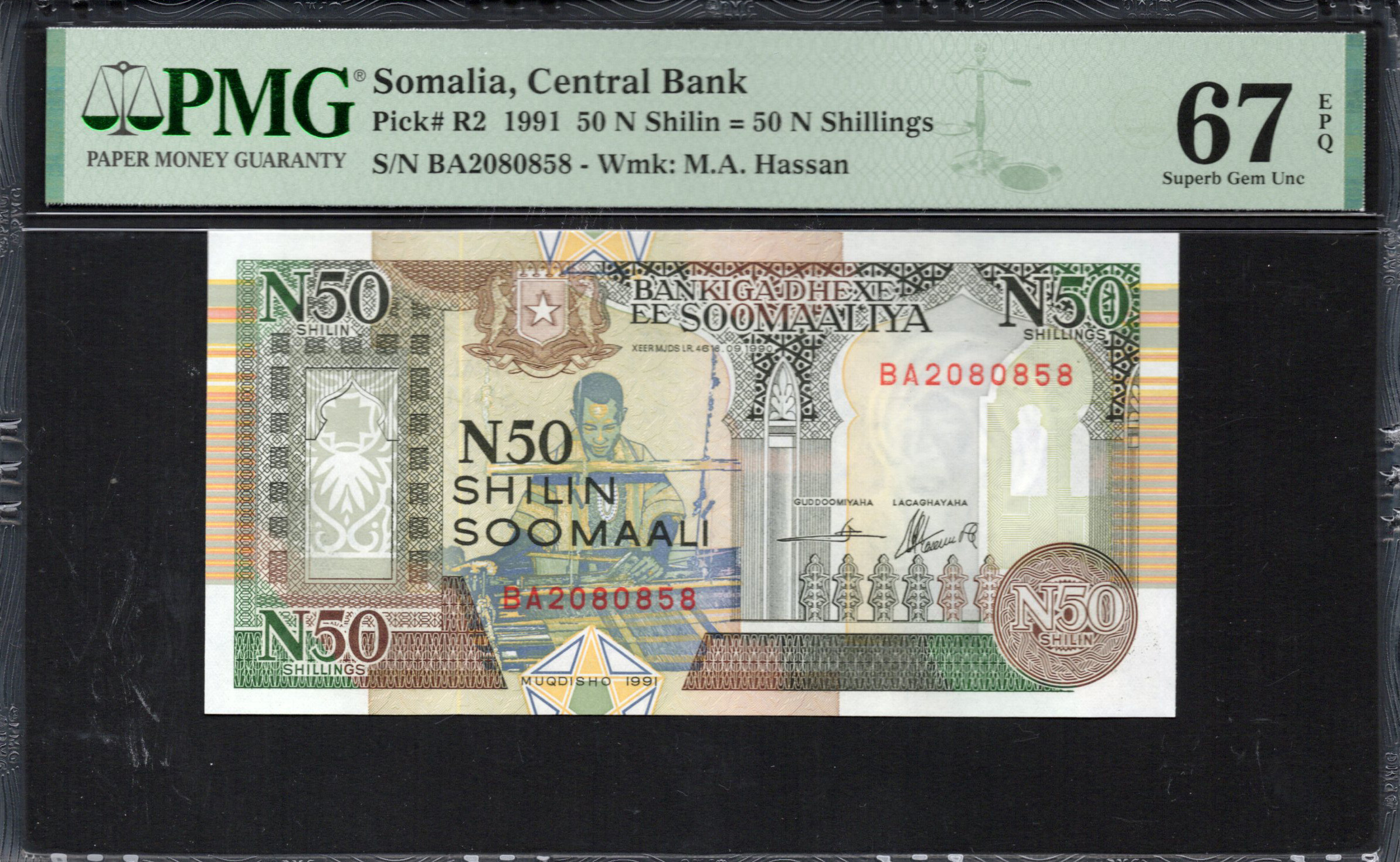 Le billet affiché est un billet de 50 Shillings du Somalié, émis en 1991. Il présente des caractéristiques artistiques et de sécurité distinctes qui sont significatives dans la conception de la monnaie. Les motifs complexes et les couleurs vives reflètent la culture somalienne, tandis que les hologrammes et les filigranes assurent l'authenticité. Ce billet n'est pas seulement un moyen d'échange, mais aussi une œuvre d'art qui véhicule l'histoire et l'identité de la Somalie.