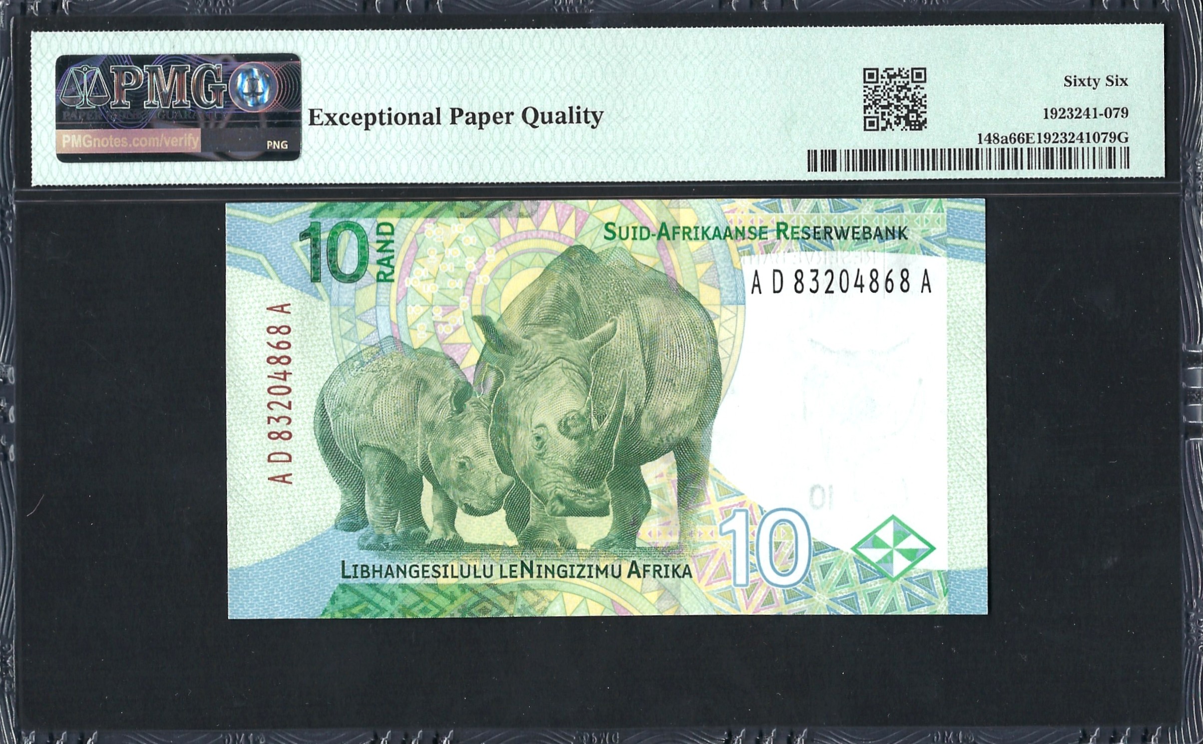Au dos du billet, on découvre une représentation saisissante d'un rhinocéros, mettant en avant la richesse de la faune sud-africaine. Le design est complété par des nuances de vert et de bleu, créant un effet visuel dynamique. L'arrière-plan présente des formes géométriques complexes qui reflètent la fierté nationale et la diversité du pays. Des éléments de sécurité, tels qu'une fenêtre transparente et des fibres colorées, sont intégrés dans le tissu du billet, augmentant ainsi sa protection contre la contrefaçon. Ce côté du billet encapsule à la fois la signification culturelle et la technologie moderne de la monnaie.