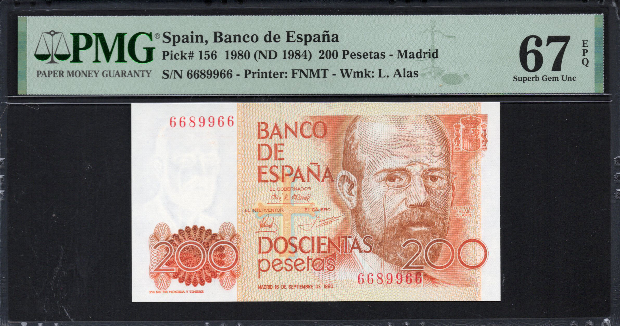 Le recto du billet de 200 Pesetas est marqué par un design complexe présentant le portrait d'une personnalité marquante de l'histoire espagnole. Autour du portrait se trouvent divers éléments décoratifs, le nom de la banque 'Banco de España' étant clairement affiché. La dénomination est indiquée en chiffres grands et gras dans le coin inférieur gauche, accompagnée du texte 'Doscientas pesetas'. L'arrière-plan présente des motifs subtils et des dégradés de couleurs, augmentant son attrait esthétique tout en intégrant des éléments de sécurité tels que le microtexte pour prévenir la fraude.