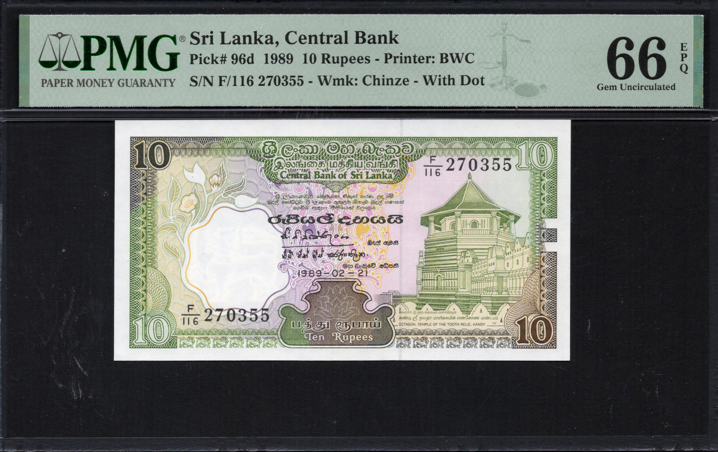 Le recto de ce billet de 10 roupies met en avant divers symboles culturels, y compris des dessins floraux élaborés et l'image frappante du Temple de la Dent. Les motifs complexes et les dégradés de couleurs, principalement en vert et en rose, augmentent son attrait esthétique. La dénomination '10' apparaît plusieurs fois, assurant la clarté pour les utilisateurs. De plus, des caractéristiques de sécurité telles qu'un filigrane et des microtextes peuvent être détectées sous la lumière UV, ajoutant à l'intégrité du billet et à sa protection contre la contrefaçon.