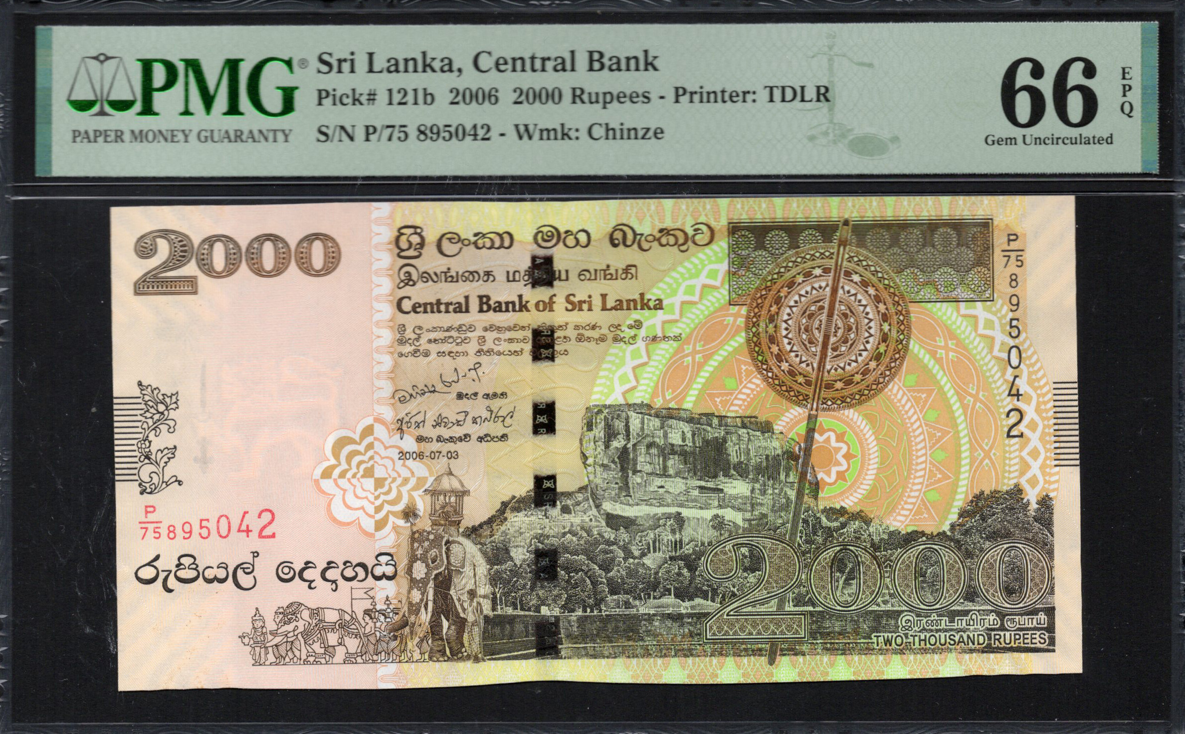L'avers du billet de 2000 roupies met en valeur un mélange de couleurs, principalement orange et vert, créant un attrait visuel vibrant. Le nombre proéminent '2000' est affiché en lettres grasses, complété par les mots 'Banque centrale du Sri Lanka' en cinghalais et en tamoul. Le billet présente une représentation de la célèbre forteresse rocheuse de Sigiriya, un site du patrimoine mondial de l'UNESCO, symbolisant l'importance historique de la nation. De plus, divers motifs ornementaux et micro-impressions peuvent être trouvés, améliorant sa valeur artistique tout en servant de caractéristiques de sécurité.