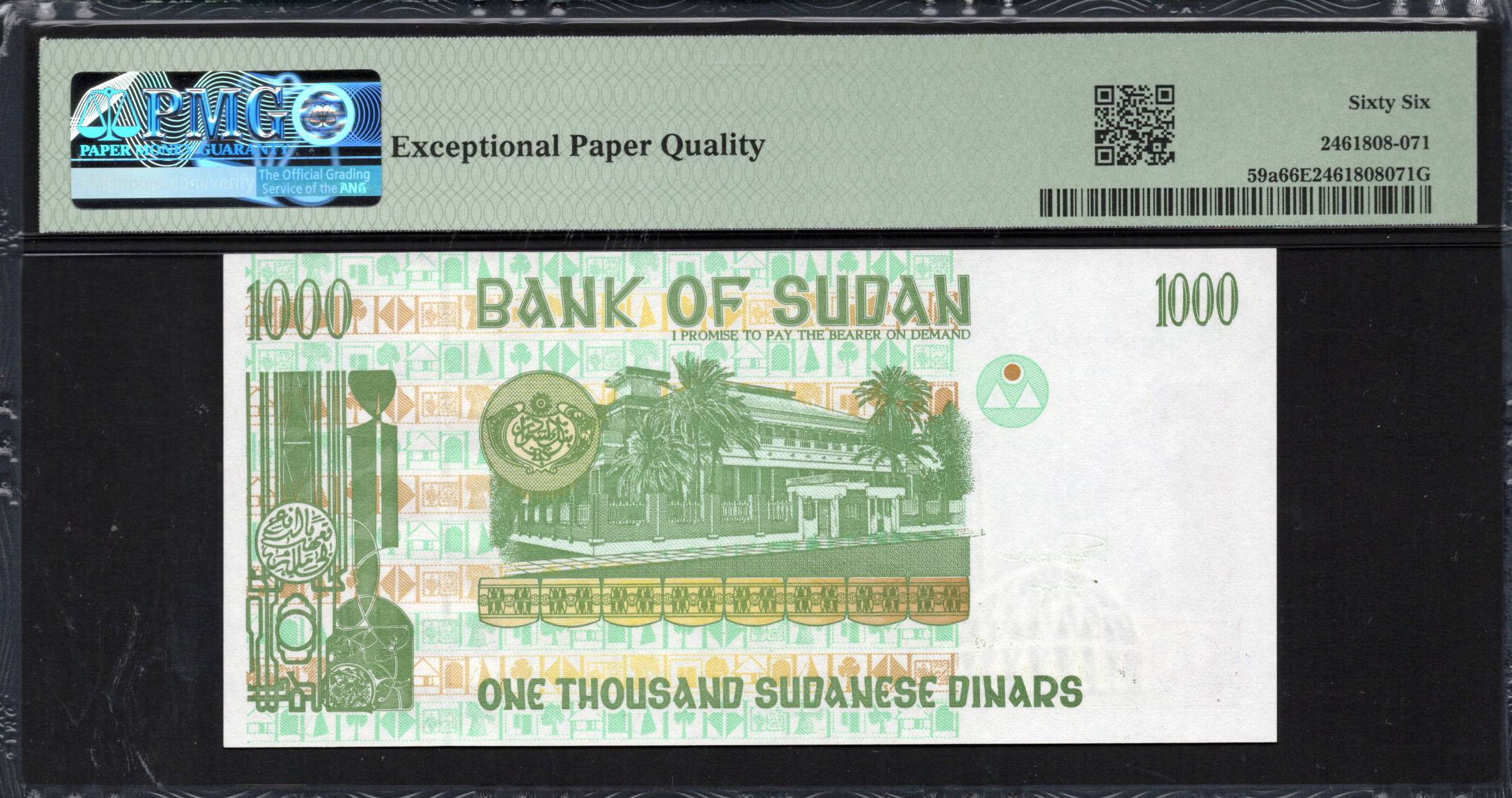 Le recto du billet de 1000 Dinars présente un design élégant caractérisé par une combinaison de teintes vertes et de motifs complexes. La dénomination est affichée de manière proéminente en arabe et en anglais, accompagnée de motifs ornementaux qui reflètent les éléments culturels soudanais. Le billet comprend une image en filigrane d'un symbole historique, renforçant sa sécurité. On trouve également un microtexte le long des bords, rendant la contrefaçon plus difficile. L'ensemble des dégradés de couleur et des motifs décoratifs crée une esthétique visuellement attrayante qui met en valeur le savoir-faire artistique derrière son design.