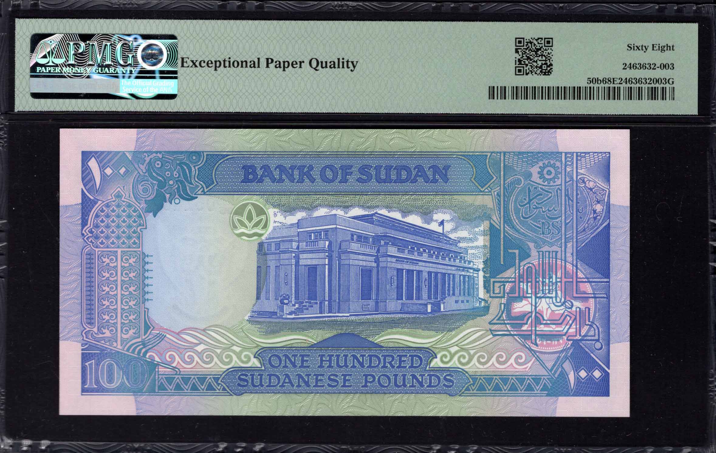 Le recto du billet de 100 £ est dominé par une illustration détaillée d'un bâtiment historique, caractérisé par ses multiples fenêtres et son style architectural, reflétant probablement le riche patrimoine architectural du Soudan. Aux côtés du bâtiment, des motifs complexes et des feuillages entourent la dénomination '100', rendue dans des nuances vives de bleu et de vert. Le billet présente des éléments de sécurité tels qu'un symbole en filigrane de la Banque du Soudan et des micro-impressions à peine visibles à l'œil nu. Ces éléments artistiques et fonctionnels rehaussent non seulement l'attrait esthétique, mais également la sécurité contre la contrefaçon.