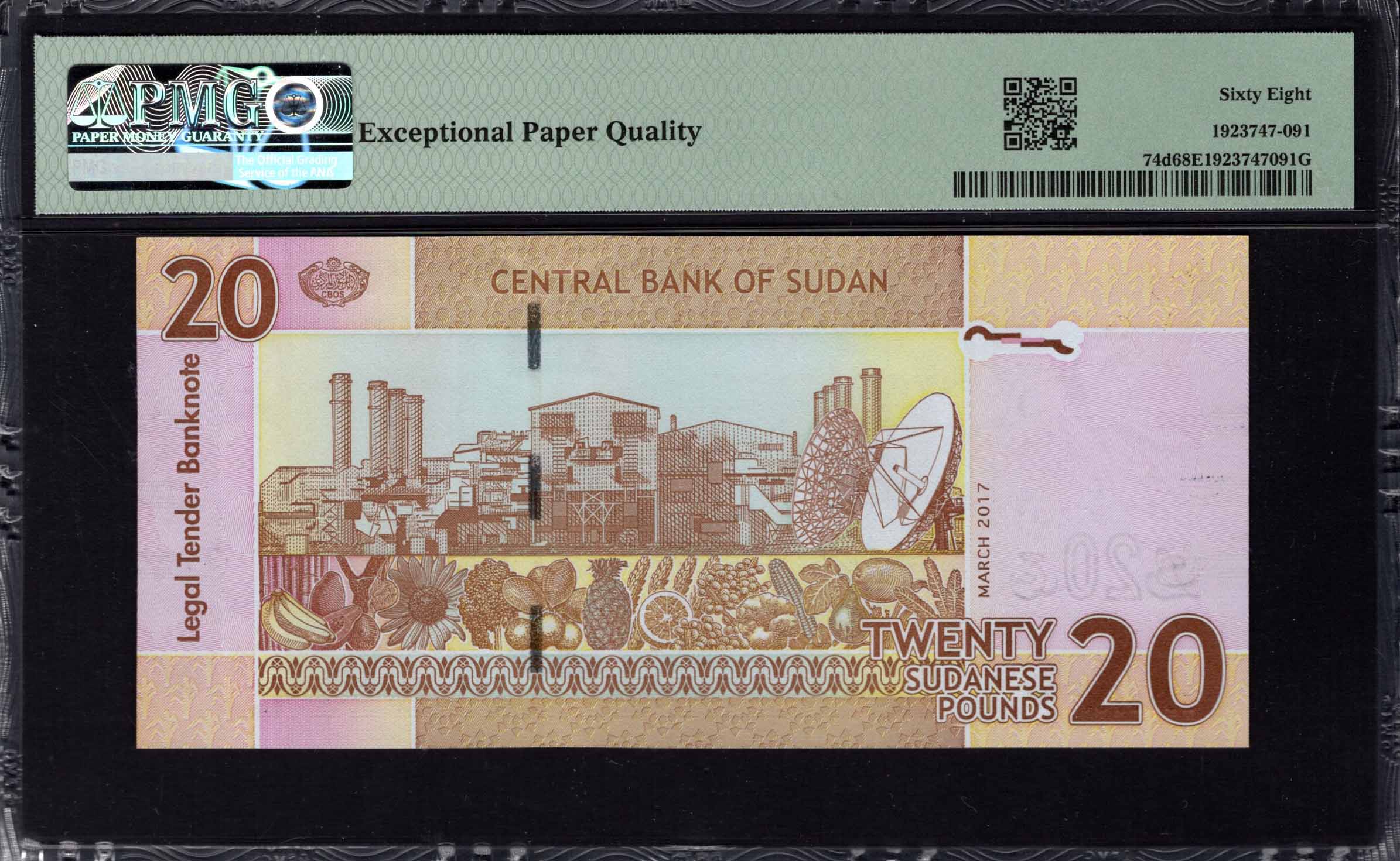 Le recto du billet de 20 livres soudanaises est richement décoré de couleurs vives et présente une image marquante de l'Oiseau secrétaire, une espèce aviaire emblématique de la région. Autour de cette figure centrale se trouvent des motifs et designs complexes qui accroissent son attrait esthétique. L'arrière-plan montre une variété d'éléments industriels symbolisant l'économie soudanaise. Les caractéristiques de sécurité comprennent un filigrane représentant l'Oiseau secrétaire, une microimpression et des couleurs changeantes. Ces éléments ajoutent non seulement de la beauté au billet, mais aident également à prévenir la contrefaçon, alliant ainsi expression artistique et sécurité pratique.