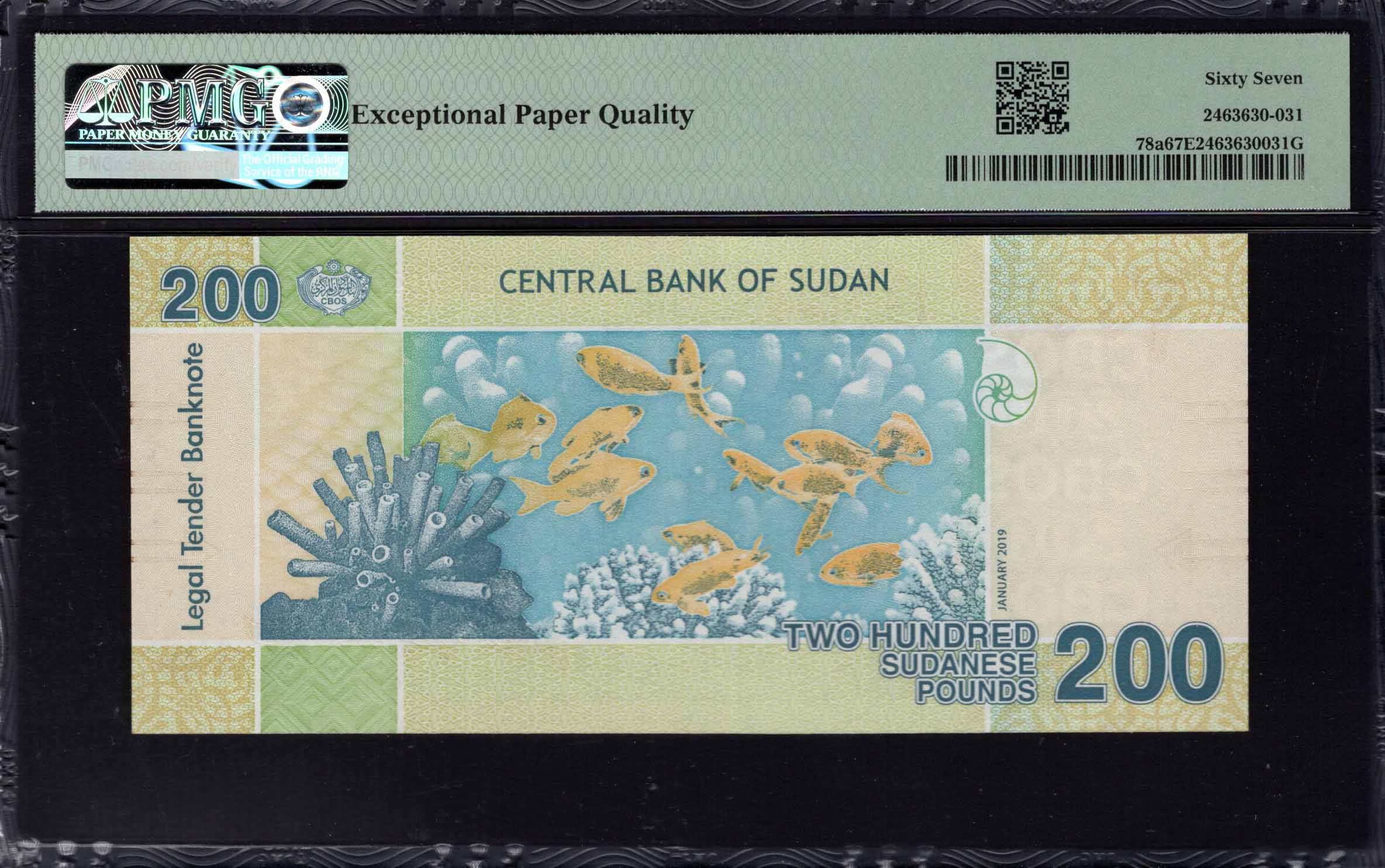 Le recto du billet présente principalement un paysage serein avec divers oiseaux et une végétation luxuriante, illustrant la beauté naturelle du Soudan. L'arrière-plan affiche des teintes vertes vives mélangées à un bleu doux, créant un dégradé visuellement attrayant. Un texte en arabe est affiché en évidence, indiquant la dénomination de 200, tandis que des motifs ornementaux encadrent le design, rehaussant sa qualité artistique. Des éléments de sécurité notables, tels qu'un filigrane et une micro-impression, sont intégrés dans l'œuvre pour prévenir la contrefaçon, indiquant l'engagement de la banque envers la sécurité.