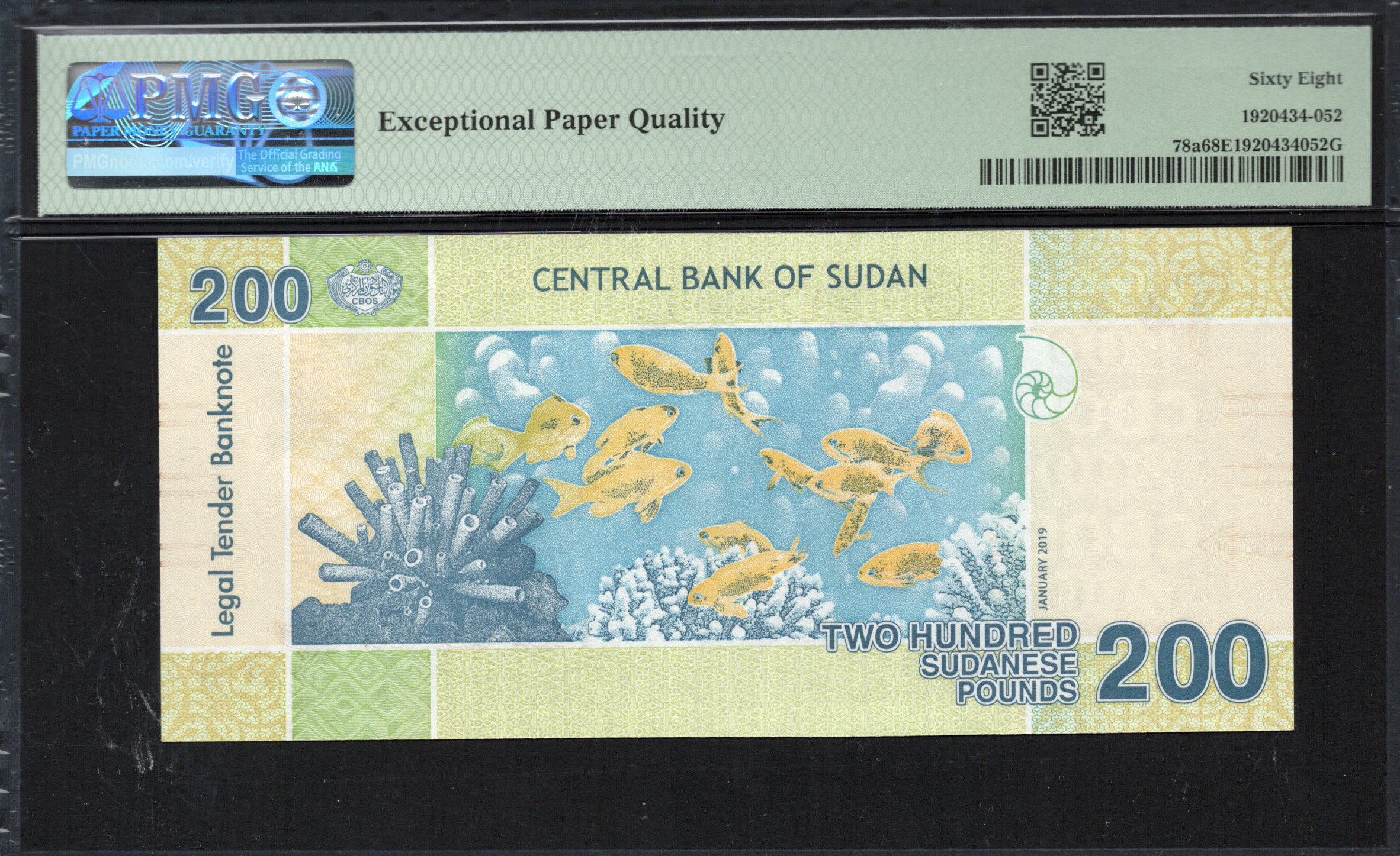 Le recto du billet présente une scène frappante de deux oiseaux indigènes du Soudan, représentés avec élégance au milieu d'un paysage luxuriant. Les détails élaborés capturent une cascade et la verdure, mettant en avant la beauté naturelle de l'environnement soudanais, accentuée par des dégradés de couleurs doux, principalement verts et jaunes. Il existe des motifs ornementaux le long des bords, renforçant l'attrait esthétique. Des éléments de sécurité tels qu'un filigrane et une micro-impression peuvent être observés, ajoutant de la crédibilité au billet et démontrant les pratiques modernes de conception monétaire.