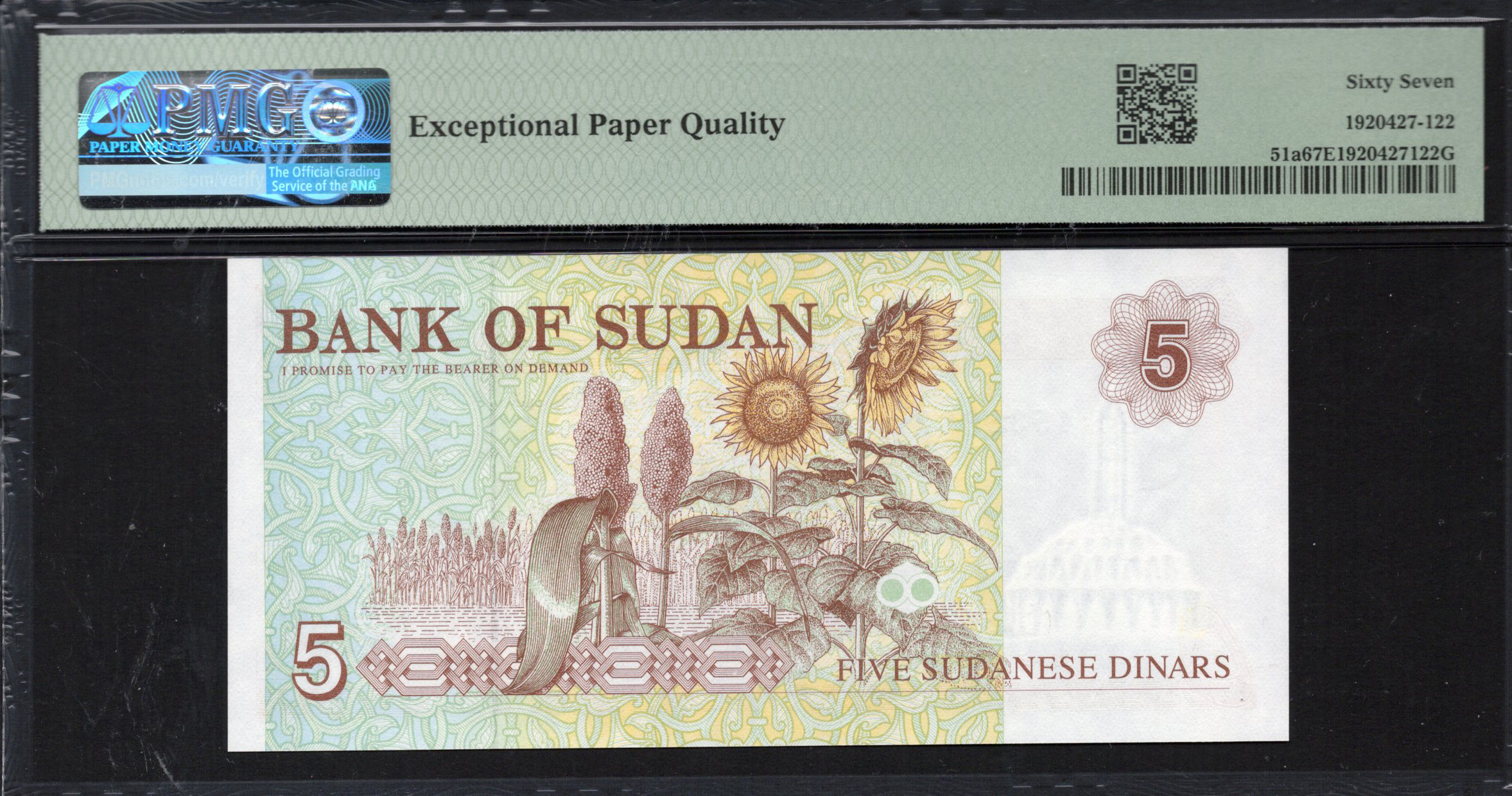 Le billet de 5 Dinars de la Banque du Soudan, émis en 1993, affiche des designs complexes et des couleurs vives, représentant le riche patrimoine soudanais. Ce billet présente une structure en dôme en arrière-plan, symbolisant l'élégance architecturale, tandis que des motifs botaniques ajoutent une touche de nature au design. Des caractéristiques de sécurité remarquables incluent une micro-impression et un filigrane, garantissant l'authenticité. Ce billet est une représentation à la fois de l'art et de la technologie, incarnant l'essence du Soudan.