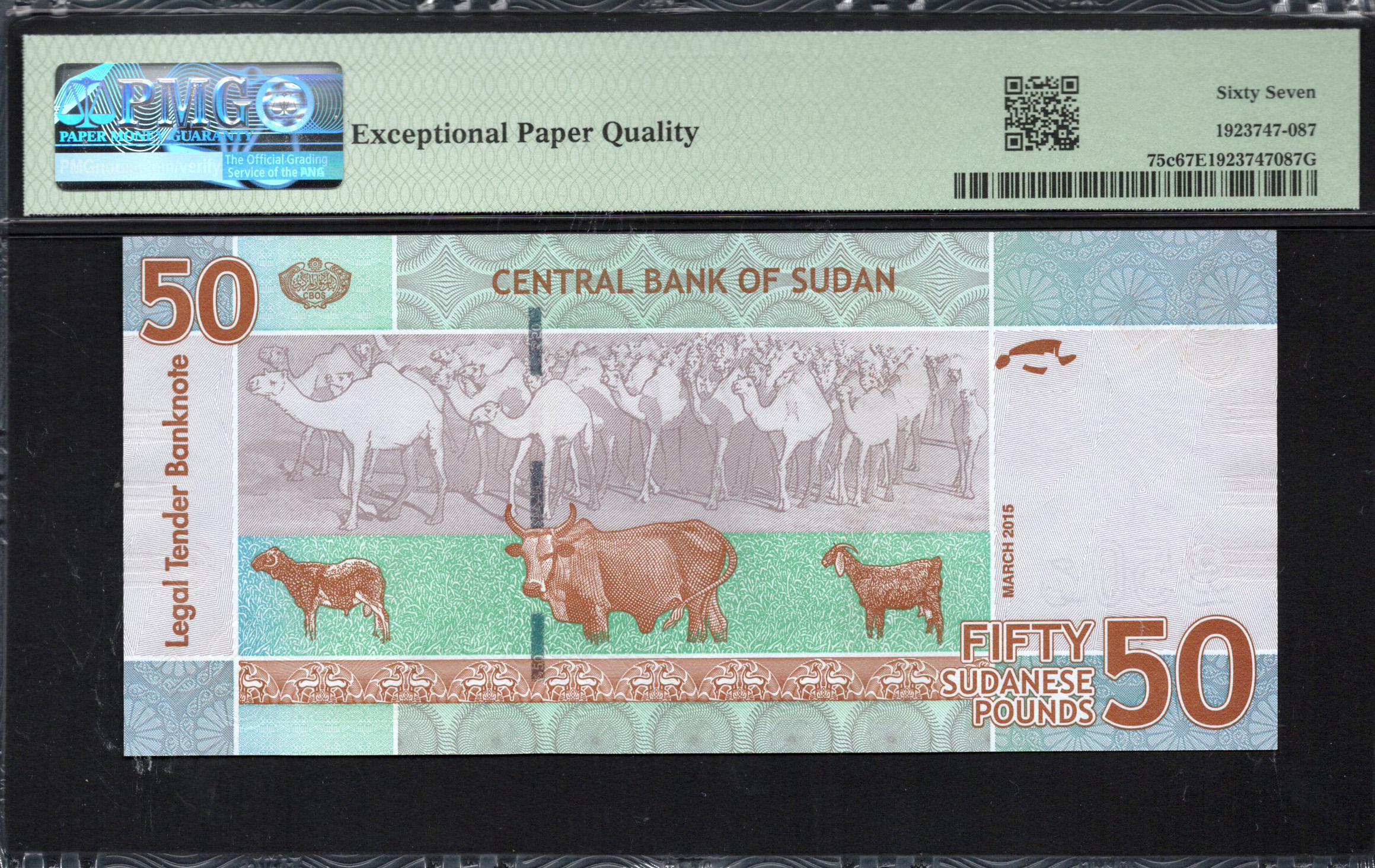 Le recto du billet de 50 £ affiche une illustration vibrante d'éléphants sur fond de verdure luxuriante. Cette représentation reflète la riche faune du Soudan. Sur le côté gauche, un emblème en diamant rouge, accompagné de l'indicateur de dénomination en arabe, apporte à la fois une esthétique plaisante et une identification claire de la valeur du billet. En dessous, un motif fin ajoute de la profondeur et de la sécurité, tandis que le filigrane et le microtexte sont intégrés de manière fluide pour renforcer la protection contre la contrefaçon.