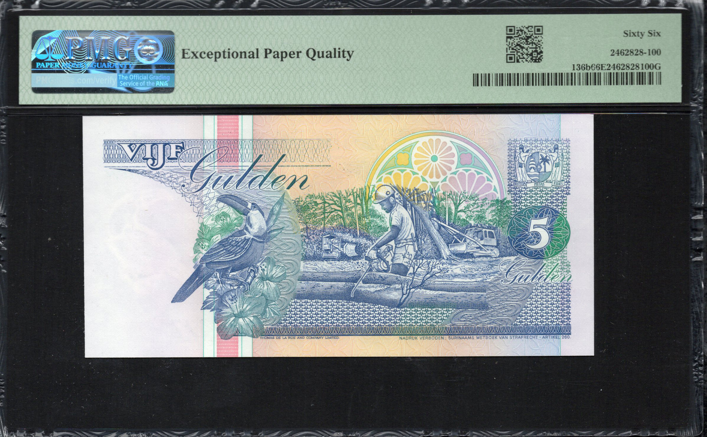 Le verso du billet de 5 Gulden enrichit davantage son récit artistique. Il présente une illustration vivante d'éléments floraux locaux, indicatifs de la riche biodiversité de Suriname. Les arrangements de couleurs élaborées augmentent l'intérêt visuel, fournissant un contraste frappant avec le recto. Ce côté présente également des caractéristiques de sécurité supplémentaires, qui peuvent inclure des motifs subtils et des éléments changeant de couleur selon l'angle de vue. Les informations concernant la date d'émission et d'autres détails sont incluses en microécriture autour des motifs floraux, mettant en valeur le design complexe du billet et les mesures prises pour assurer sa sécurité contre la contrefaçon.