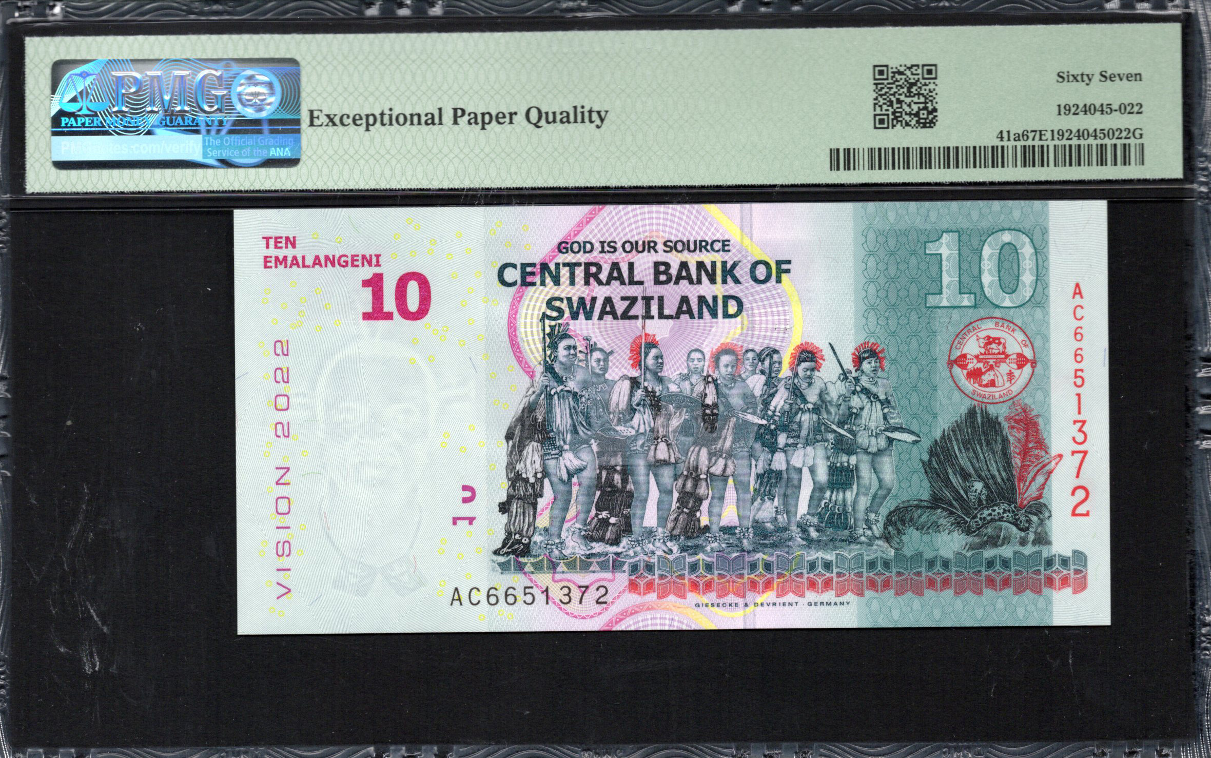 Le recto du billet présente un portrait frappant d'une personnalité notable, probablement une figure historique ou politique d'Eswatini. L'utilisation de couleurs vives telles que le vert et le rose crée une atmosphère dynamique. Au-dessus du portrait se trouve l'inscription 'CENTRAL BANK OF SWAZILAND', indiquant son statut officiel. Il convient de noter les divers éléments décoratifs, y compris des motifs géométriques qui reflètent l'art local. Les caractéristiques de sécurité peuvent inclure un filigrane, visible uniquement lorsqu'il est tenu à la lumière, ainsi que du microtexte et éventuellement une bande holographique, garantissant son authenticité.