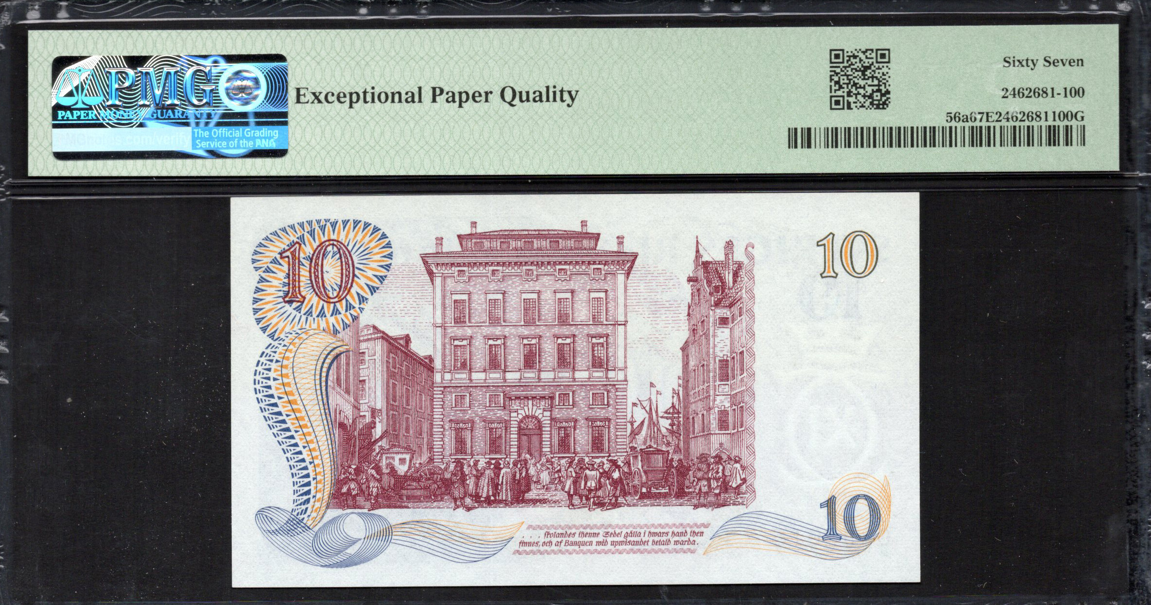 Au revers, le billet de 10 Kronor présente une majestueuse figure allégorique, représentant probablement la prospérité ou la nationalité, assise au milieu de motifs floraux tourbillonnants. Derrière elle, un artwork détaillé inclut une tête de lion proéminente, symbolisant la force. Les années '1668-1968' y sont inscrites, marquant le 300e anniversaire de la banque centrale, Sveriges Riksbank. La combinaison de détails complexes, de contrastes de couleurs douces et la présence de microtexte illustrent des mesures de sécurité avancées conçues pour prévenir les contrefaçons, augmentant ainsi ses attributs artistiques et fonctionnels.