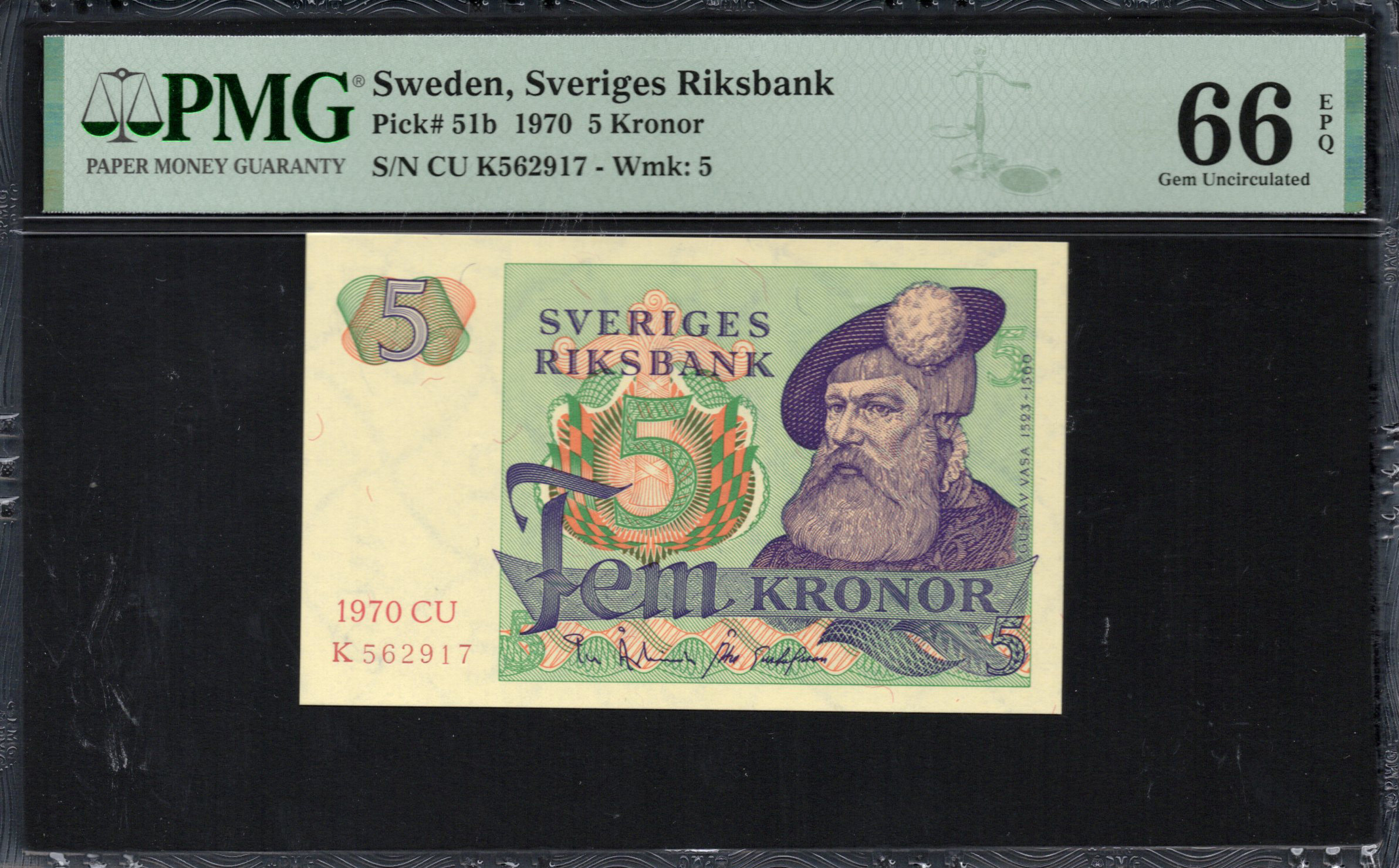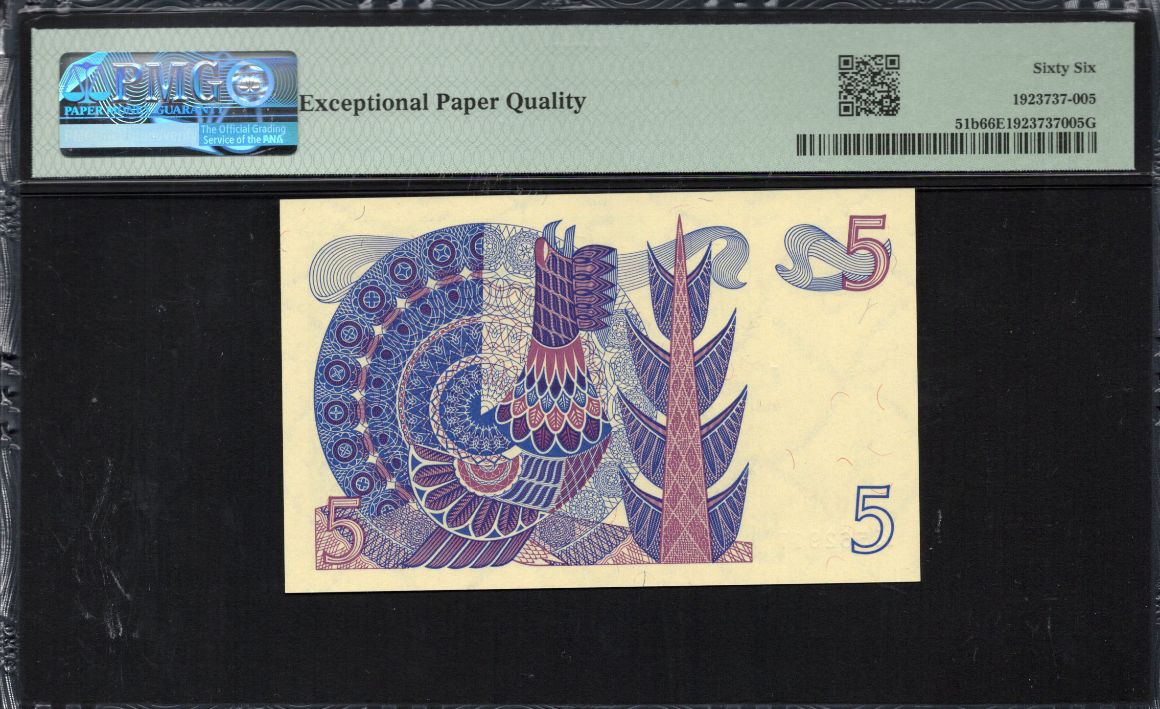 Le verso du billet maintient le thème des couleurs, présentant des motifs délicats qui complètent le portrait. Il inclut à nouveau la dénomination '5', ainsi que l'emblème suédois et des caractéristiques de sécurité supplémentaires. Le design détaillé est révélateur de la période, présentant des courbes et des formes artistiques qui ajoutent de la profondeur et de la texture au billet. Dans l'ensemble, il reflète l'engagement de la Suède envers la valeur artistique de sa monnaie.