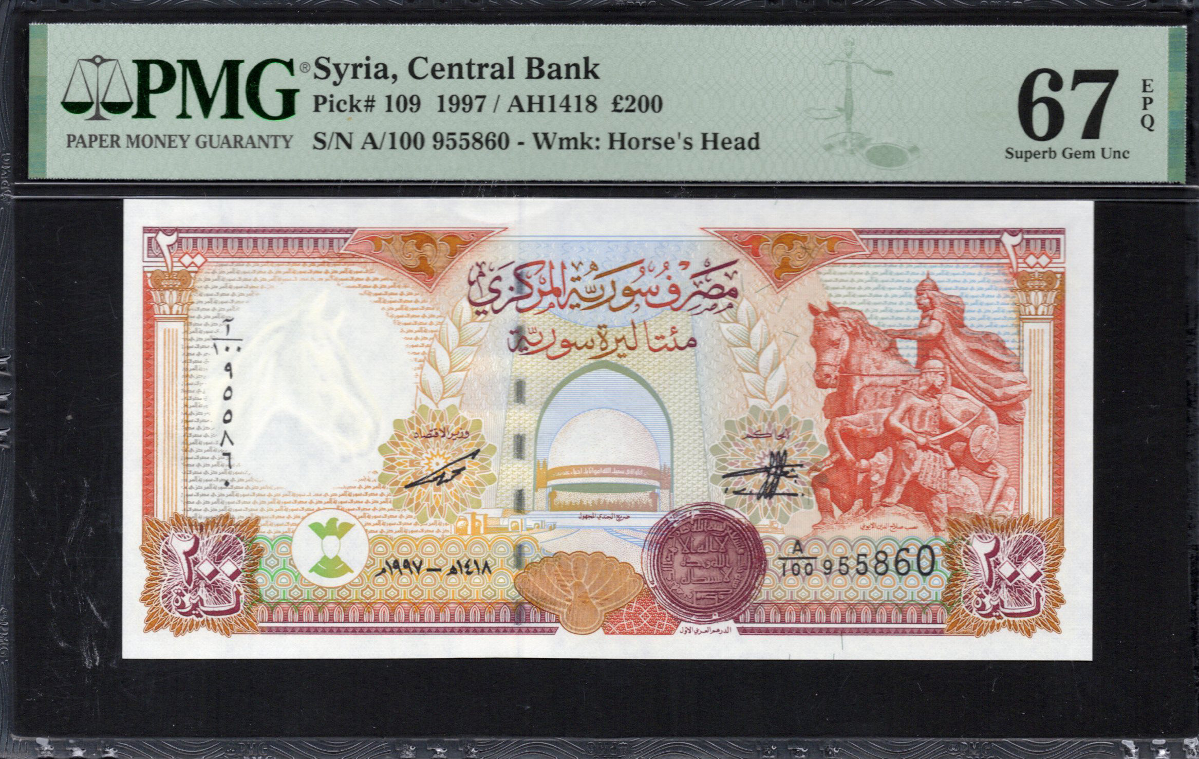 Ce billet de banque, émis par la Banque centrale de Syrie, présente divers éléments artistiques et de sécurité qui illustrent la richesse de la culture syrienne. Le billet est principalement coloré dans des teintes douces, mettant en avant une image proéminente de cavaliers à l'avant, symbolisant la force et le patrimoine. Les designs complexes témoignent de l'artisanat des billets syriens, qui incluent également des caractéristiques de sécurité nécessaires pour prévenir la contrefaçon. Ces billets font partie des transactions quotidiennes et portent une signification historique et économique.