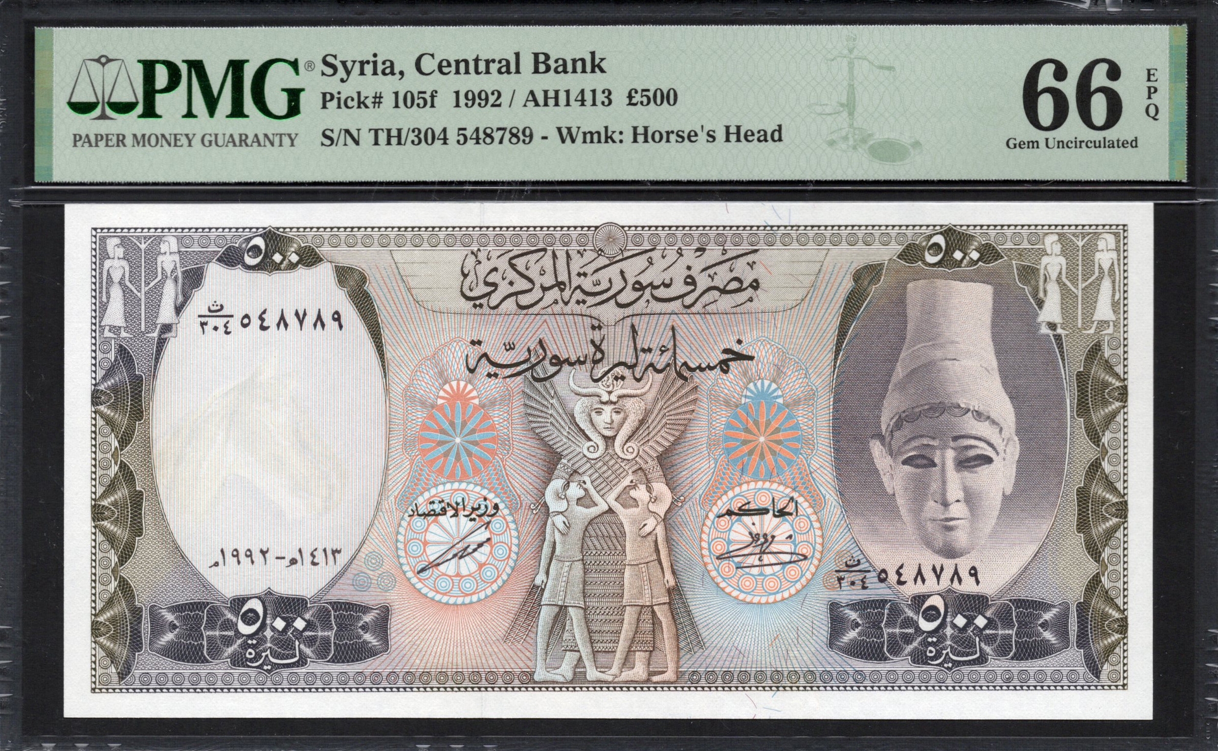Le recto du billet de banque présente un personnage historique prédominant, incarnant l'identité culturelle de la Syrie. Ce personnage est entouré d'un mélange de motifs complexes et de couleurs, principalement des tons terreux associés à des accents vibrants qui attirent le regard. Remarquables sont les motifs décoratifs qui reflètent les traditions artistiques de la région, contribuant à la signification historique du billet. La présence du logo de la banque centrale et de la dénomination renforce l'authenticité, tandis que des micro-impressions peuvent être détectées à un examen rapproché, augmentant la sécurité.