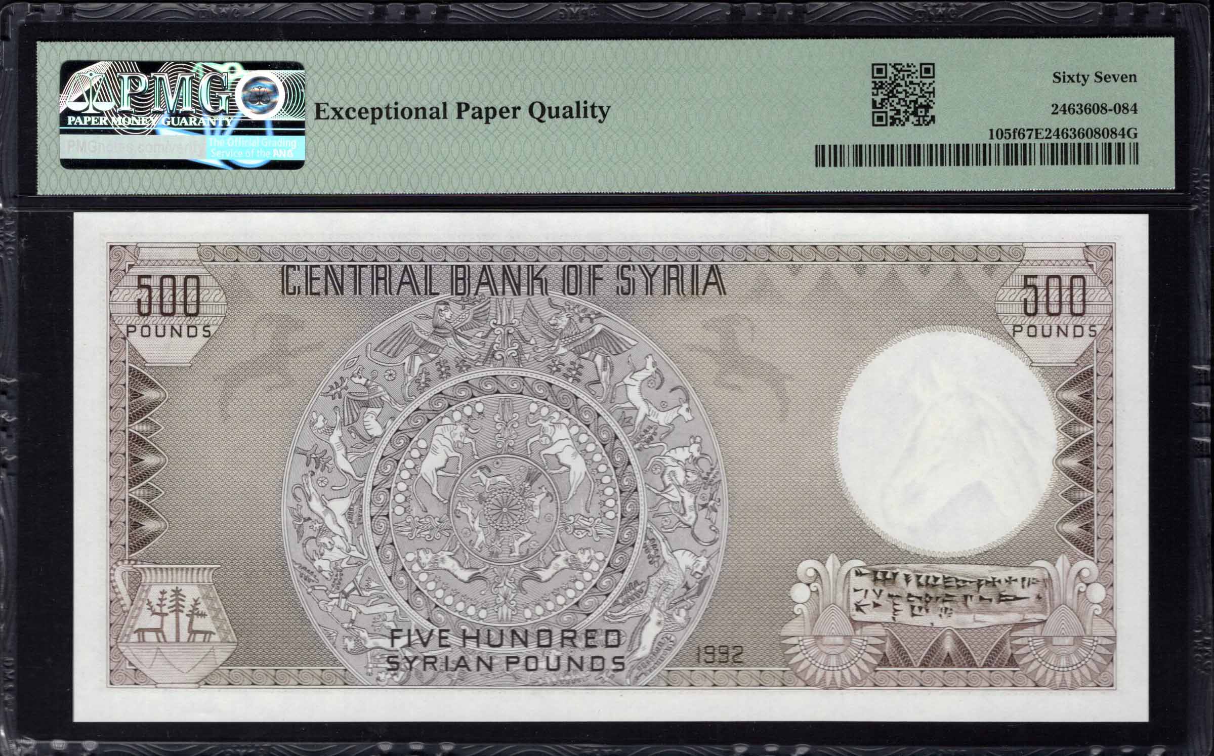 Ce billet de banque syrien présente des éléments artistiques complexes ainsi qu'une symbolique historique significative. Il reflète le patrimoine culturel de la Syrie en intégrant des motifs et figures antiques. L'utilisation de couleurs vives et de conceptions détaillées met en évidence l'importance de la monnaie en tant que représentation de l'identité nationale.