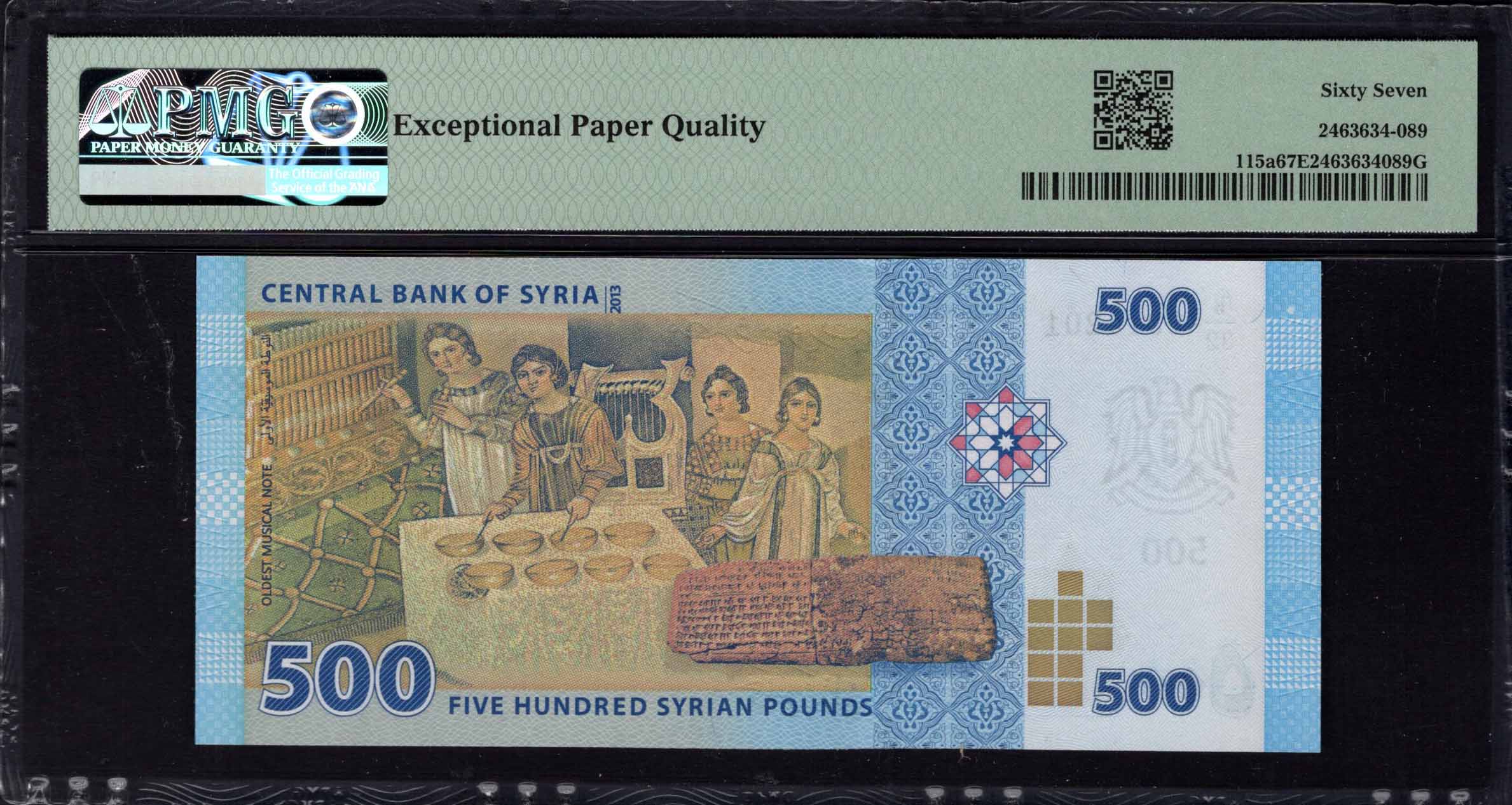 L'avers du billet présente en évidence une image de l'Opéra, un point de repère culturel important en Syrie. Autour de l'architecture, des motifs géométriques complexes ajoutent une touche artistique au design. L'utilisation de tons bleus contraste efficacement avec les autres éléments. De plus, le billet dispose d'un filigrane qui aide à prévenir la contrefaçon. La dénomination est clairement indiquée, avec le numéro '500' affiché de manière proéminente, assurant la lisibilité.