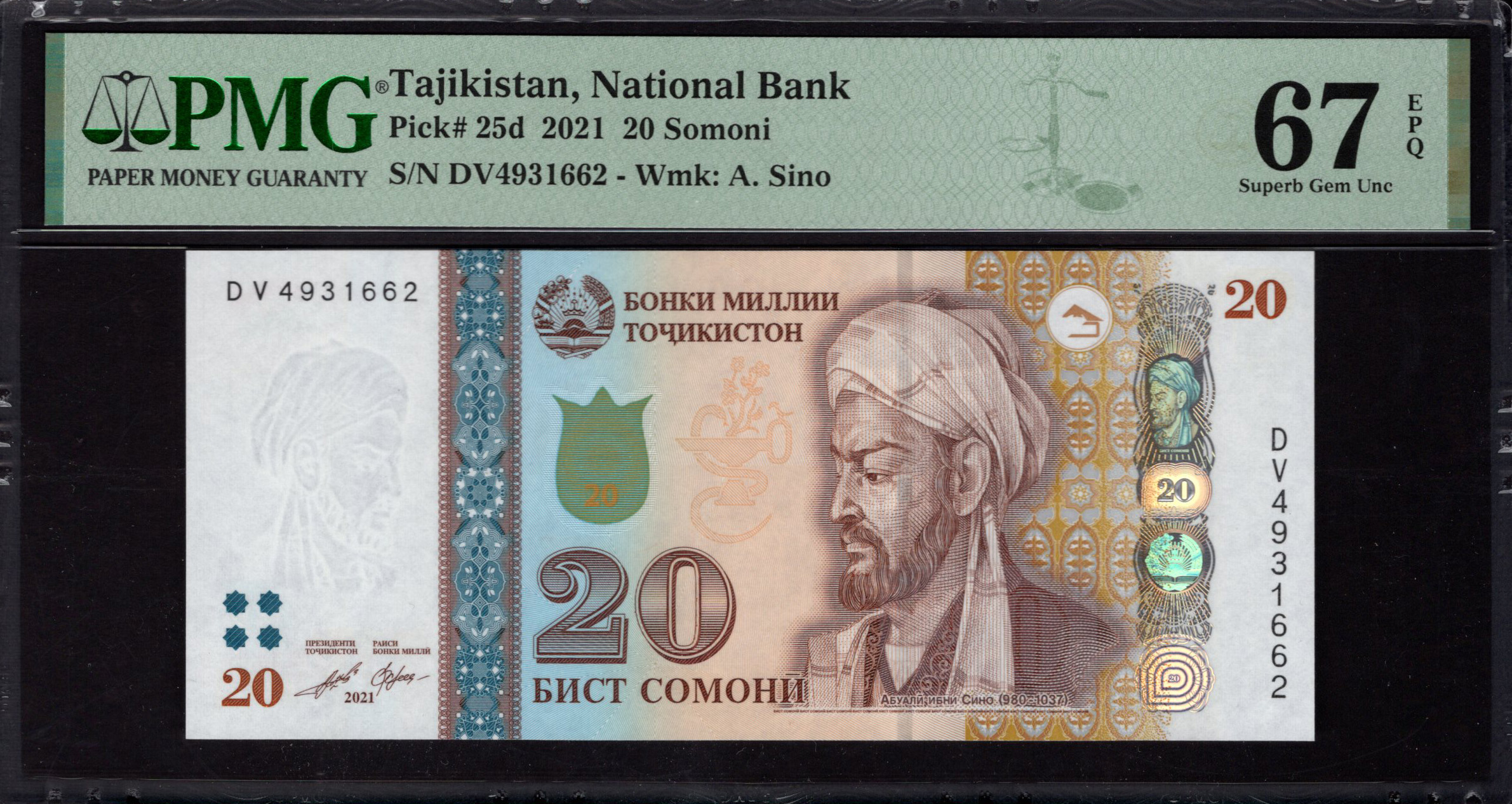 L'avant du billet de 20 Somoni présente une illustration détaillée d'une figure historique emblématique, A. Sino, connu pour ses contributions aux sciences et à la littérature. Le portrait est orné de motifs complexes et de fleurs en arrière-plan. La dénomination '20' est affichée de manière proéminente, entourée de diverses caractéristiques de sécurité telles qu'un filigrane et de la micro-impression qui renforcent l'authenticité du billet. Les couleurs de l'avant sont chaudes, avec des nuances d'orange et de beige, contribuant au charme esthétique et à l'importance culturelle.