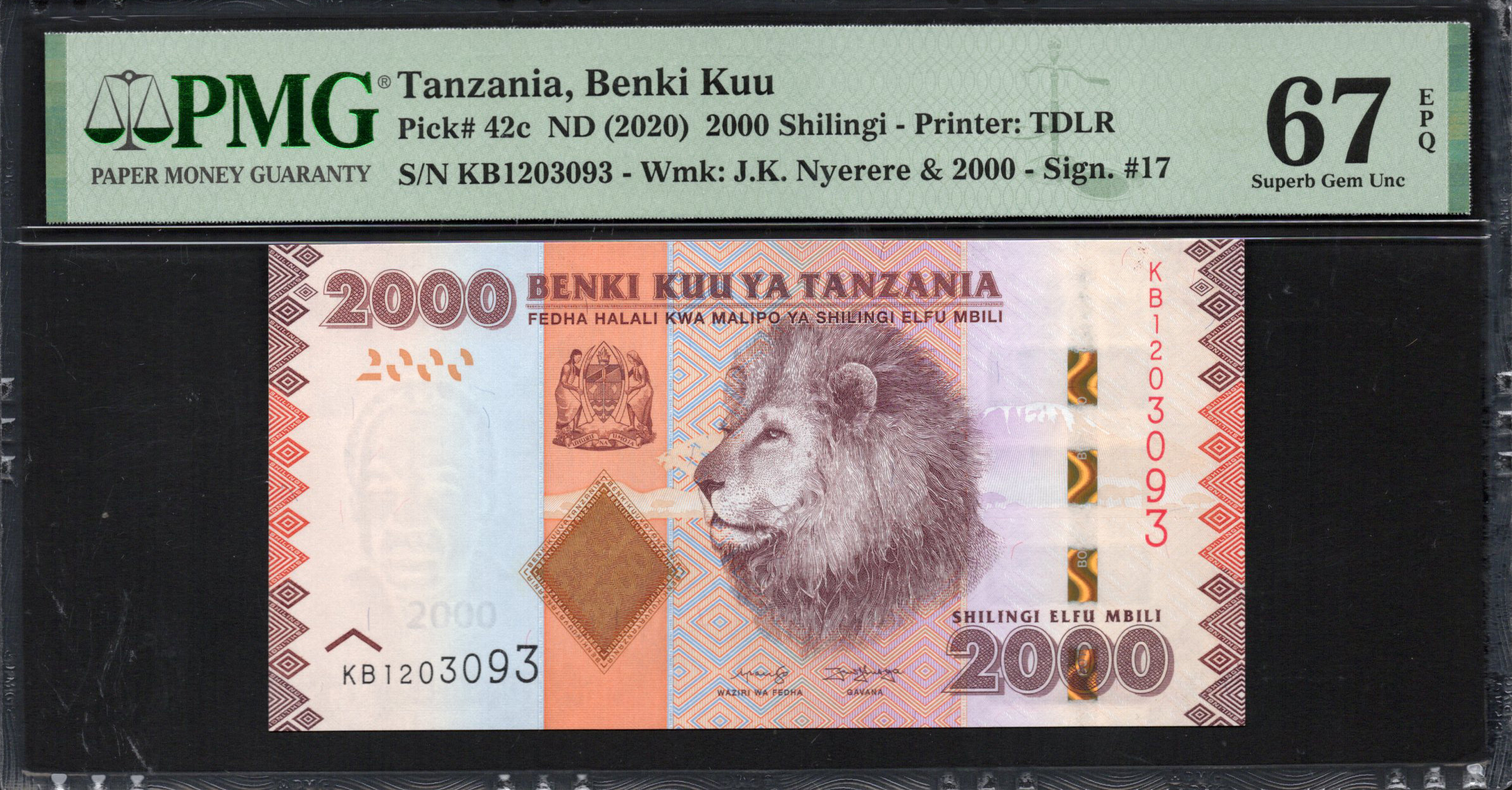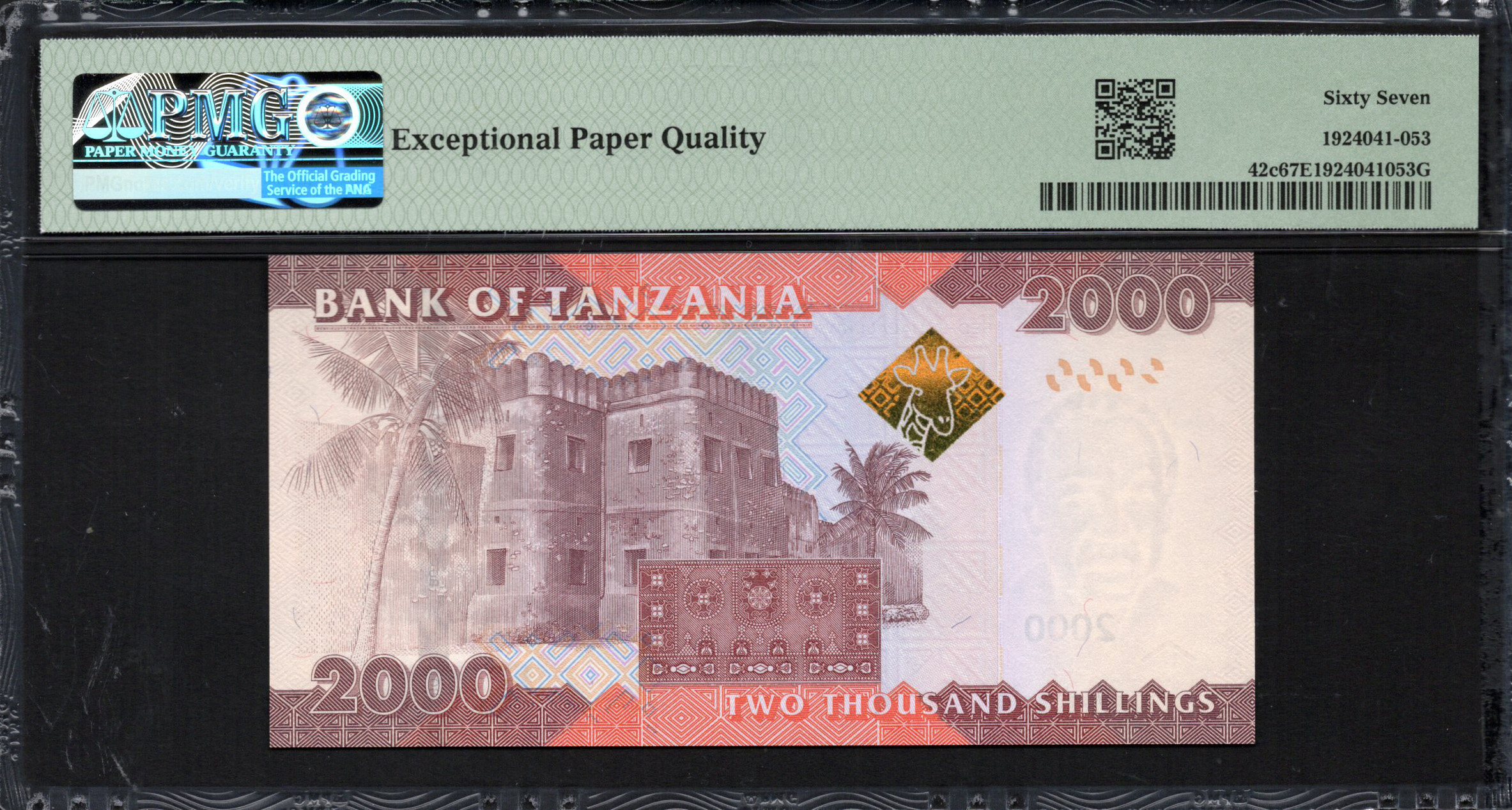 Au revers, le billet présente un design contrastant qui met encore plus en valeur les atouts naturels de la Tanzanie. Les motifs complexes et les couleurs vives accroissent l'attrait visuel. De petits détails tels qu'un emblème en forme de diamant ajoutent à la conception complexe, tandis que d'autres éléments de sécurité comme l'impression micro protègent le billet contre la contrefaçon. L'arrière-plan contient un texte supplémentaire qui réitère la dénomination, liant l'ensemble du design. Dans l'ensemble, le verso complète le recto avec une égale créativité artistique et sécurité.