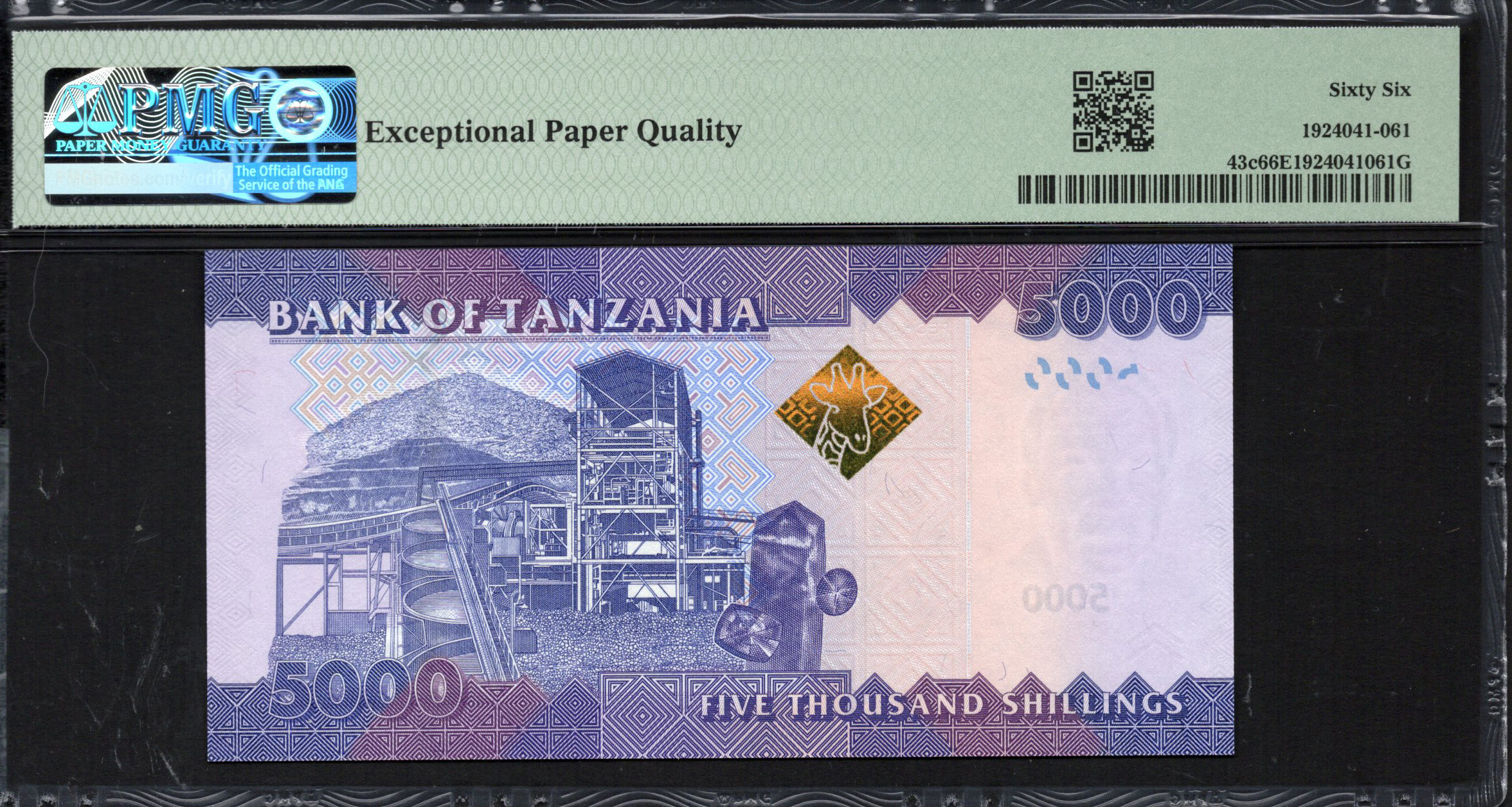 Au verso, le billet continue avec le thème de la faune, présentant une vue impressionnante de paysages de savane complétée par de plus petites images de la flore et de la faune tanzaniennes. L'arrière-plan utilise une série de motifs géométriques qui contribuent à la profondeur artistique du billet. Des éléments de sécurité tels qu'une fenêtre transparente et des hologrammes intégrés sont présents, ajoutant des couches de protection contre la contrefaçon. La dénomination '5000' apparaît de manière proéminente une fois de plus, renforçant sa valeur. Dans l'ensemble, les deux côtés du billet combinent des éléments artistiques avec des mesures de sécurité essentielles pour créer un morceau de monnaie à la fois frappant et sécurisé.