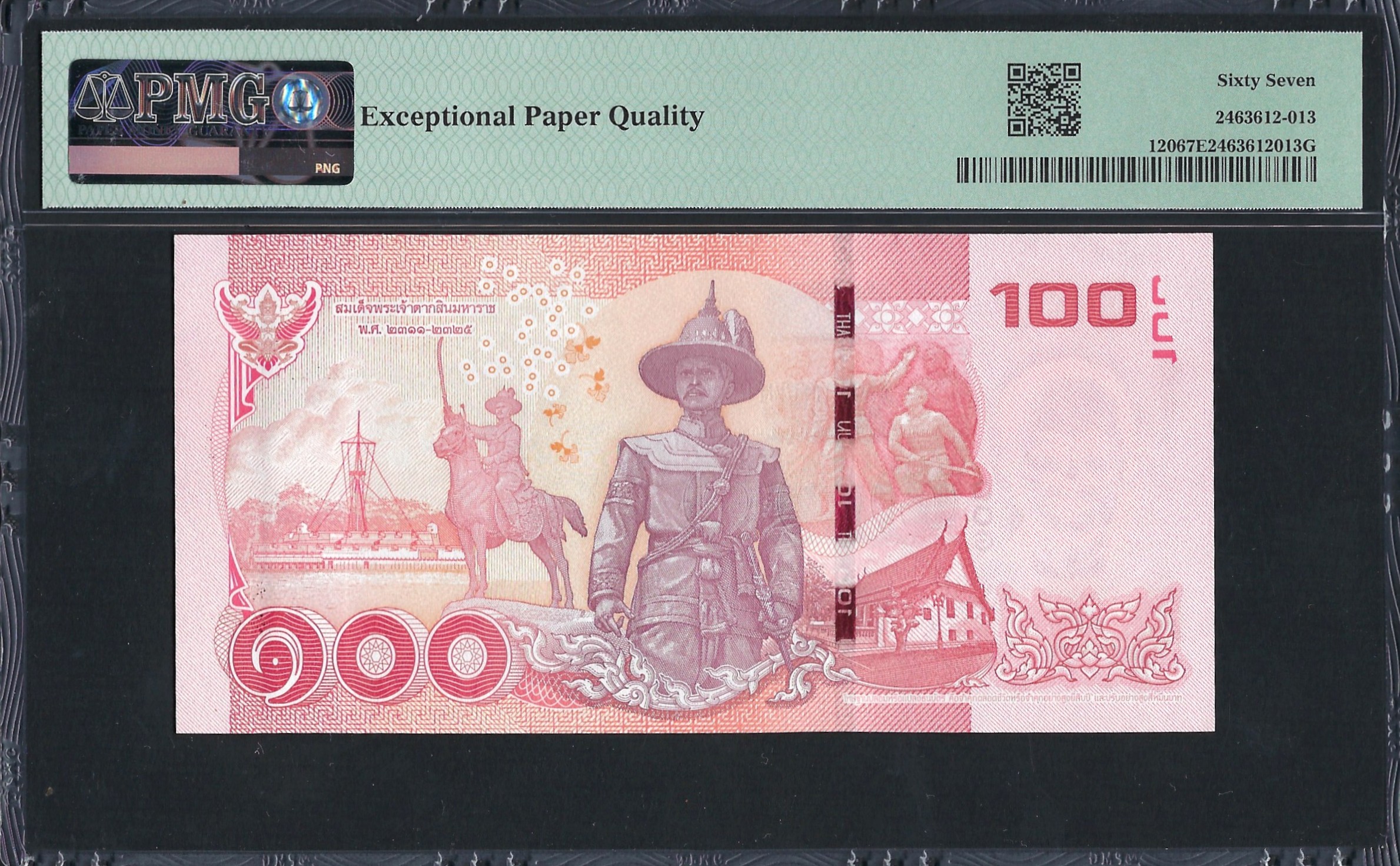 L'avers du billet de 100 Baht présente un portrait central du roi Rama IX, sur fond coloré. La nuance rose dominant est complétée par des motifs floraux décoratifs et des designs élaborés qui reflètent la culture thaïlandaise. Le design intègre des caractéristiques de sécurité telles que l'impression micro et un filigrane de l'image du roi, assurant l'authenticité. La dénomination est affichée en évidence dans le coin supérieur droit, renforcée par le texte thaïlandais confirmant la valeur du billet. La mise en page est soigneusement conçue, mêlant beauté et fonctionnalité.