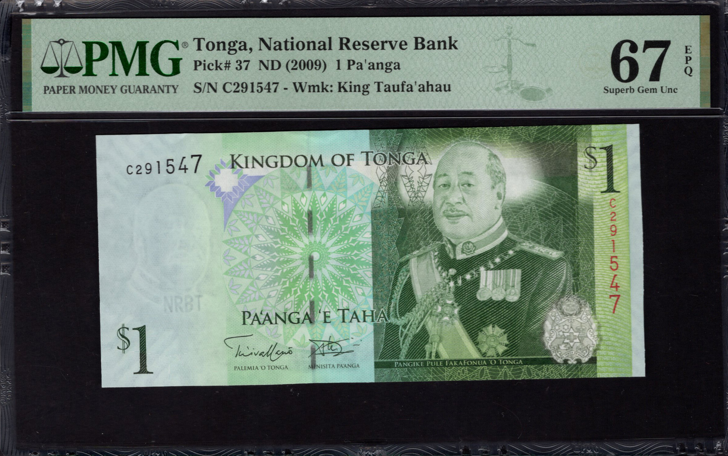 Le revers de la note d'un dollar illustre davantage l'héritage culturel des Tonga, orné de motifs et de symboles complexes qui résonnent avec l'identité nationale. Le design emploie un mélange harmonieux de nuances de vert, complétant la face avant tout en assurant une cohérence thématique. Il y a du texte en anglais et en tongien, soulignant l'identité linguistique duale du billet. Bien que l'arrière soit moins visuellement proéminent que l'avant, ses motifs contribuent à un design cohérent qui met en valeur l'artisanat du pays. Dans l'ensemble, la combinaison d'éléments de design et de caractéristiques de sécurité démontre le raffinement de la monnaie tongienne.