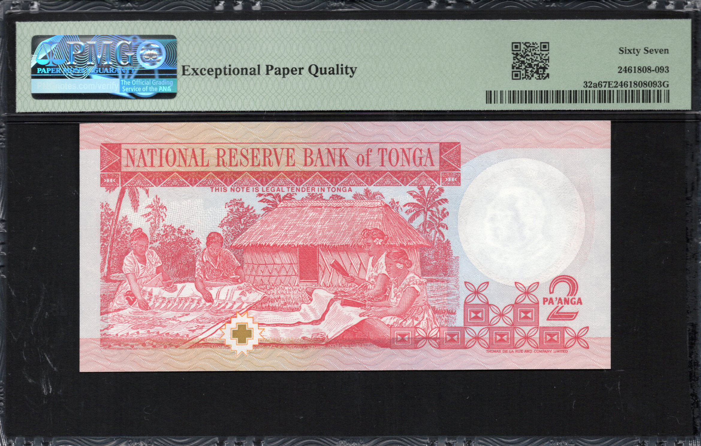 Bien que l'arrière du billet ne soit pas visible, les billets tongiens affichent généralement des symboles culturels importants qui renforcent la cohérence thématique. Souvent, des couleurs vives et des conceptions complexes sont intégrées, reflétant les motifs de l'avant. Des éléments courants comme la flore et la faune locales soulignent le riche héritage naturel du pays. Des caractéristiques de sécurité telles que la micro-impression et des éléments réactifs aux UV accompagnent souvent ces détails artistiques, visant à prévenir la contrefaçon. Ainsi, la présentation de ce billet combine élégamment protection et narration culturelle.