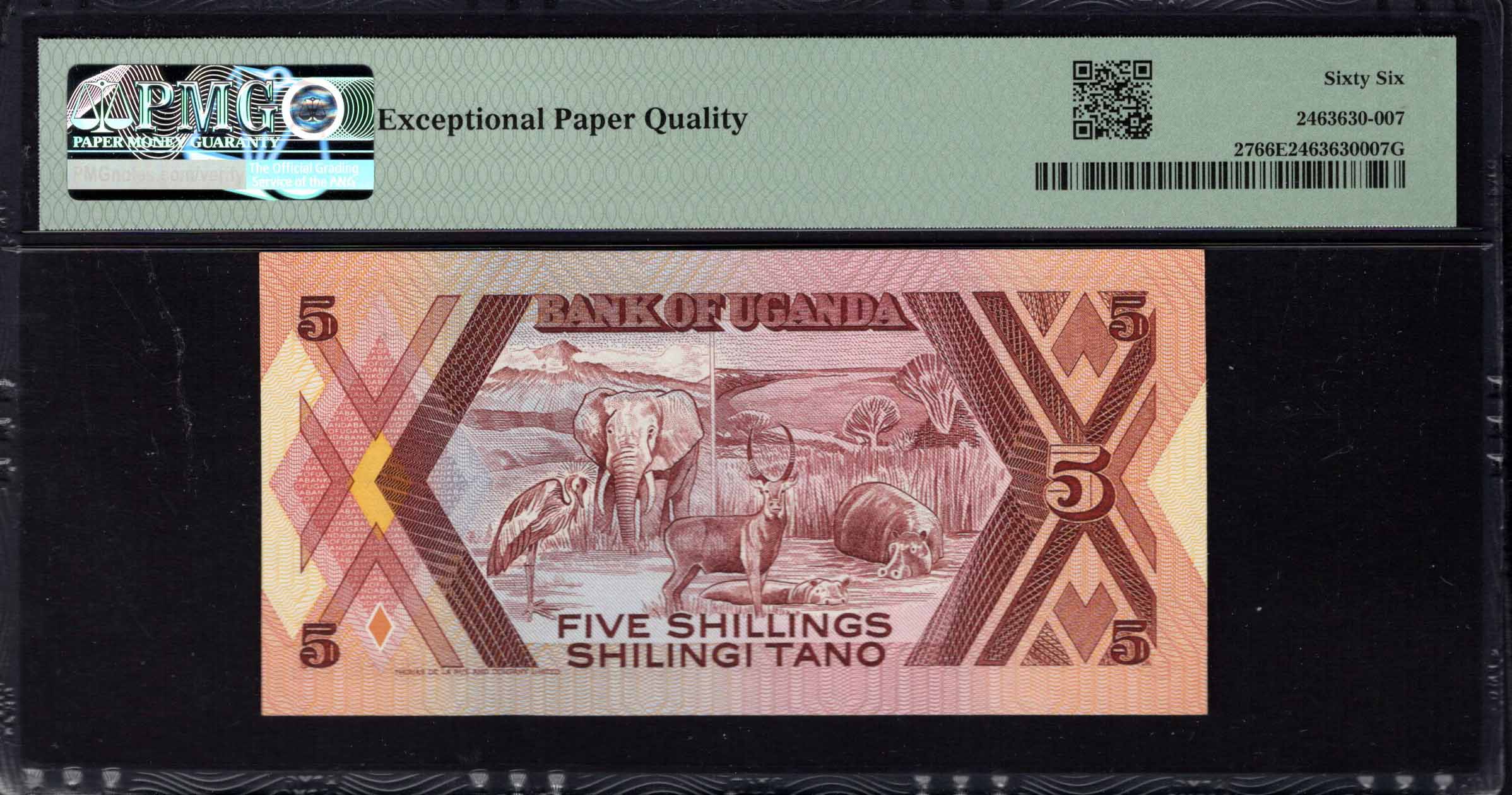Le recto du billet de 5 shillings présente principalement l'emblème national de l'Ouganda, incluant un majestueux lion. Les couleurs sont chaudes et accueillantes, principalement dans des teintes de brun et d'orange, ce qui lui donne un aspect riche et traditionnel. La dénomination est clairement affichée, avec '5' finement intégré dans chaque coin. Sous l'emblème national, la mention 'FOR GOD AND MY COUNTRY' est inscrite, reflétant la fierté nationale. Les caractéristiques de sécurité telles que le microtexte et un filigrane peuvent être discernés, ajoutant à son intégrité en tant que monnaie légale.