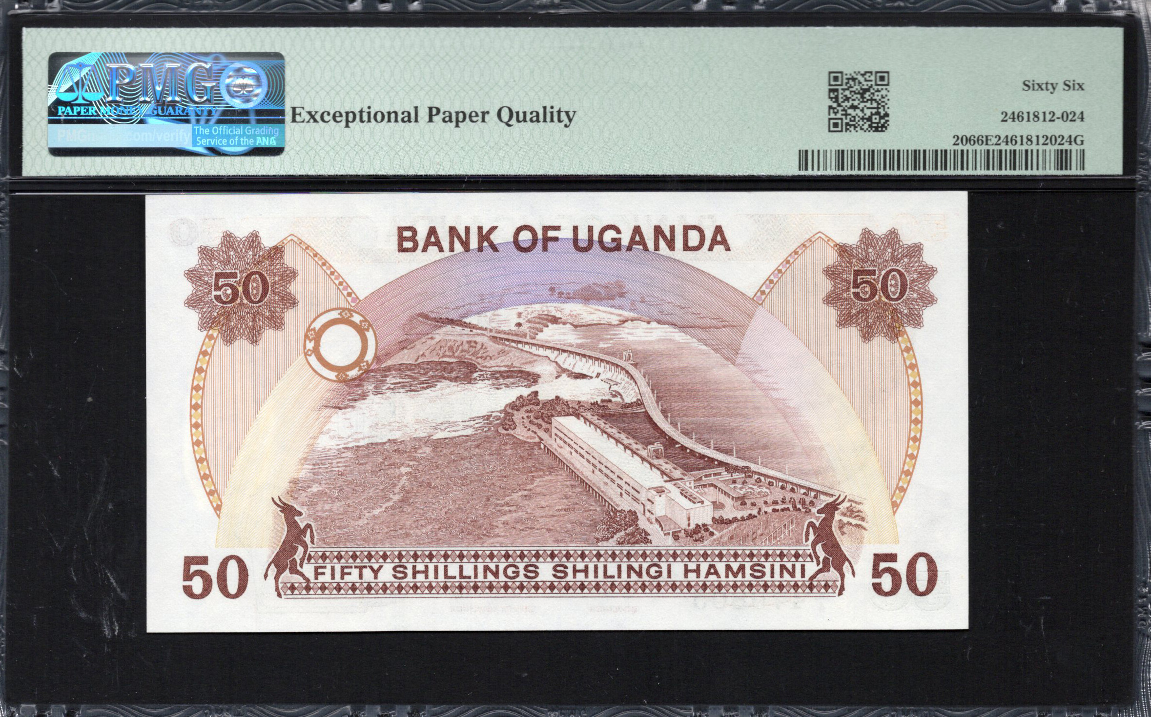 L'arrière du billet encapsule divers symboles de l'Ouganda, y compris son emblème national et d'autres motifs complexes qui reflètent l'héritage de la nation. La palette de couleurs utilise des verts et des bruns, évoquant un sens de l'environnement naturel. De plus, des éléments de sécurité tels qu'un hologramme ou des filigranes supplémentaires peuvent être présents, accentuant davantage son authenticité. Les motifs sont habilement intégrés, contribuant à la richesse visuelle du billet tout en servant de dissuasion contre la reproduction.