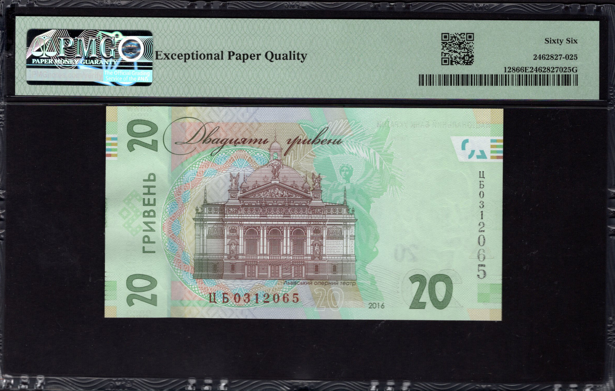 Le verso du billet présente une illustration vibrante des montagnes des Carpates, incarnant la beauté naturelle de l'Ukraine. Les couleurs sont beaucoup plus vives, avec des verts et des bleus qui créent une scène tranquille. Un autre '20' est visible de manière proéminente, accompagné de caractéristiques de sécurité comme une bande holographique et une micro-impression fine qui aident à prévenir la contrefaçon. Le design inclut également des formes géométriques abstraites et des motifs reflétant des influences artistiques modernes, offrant un contraste avec la figure historique au recto tout en restant connecté au patrimoine culturel de la nation.