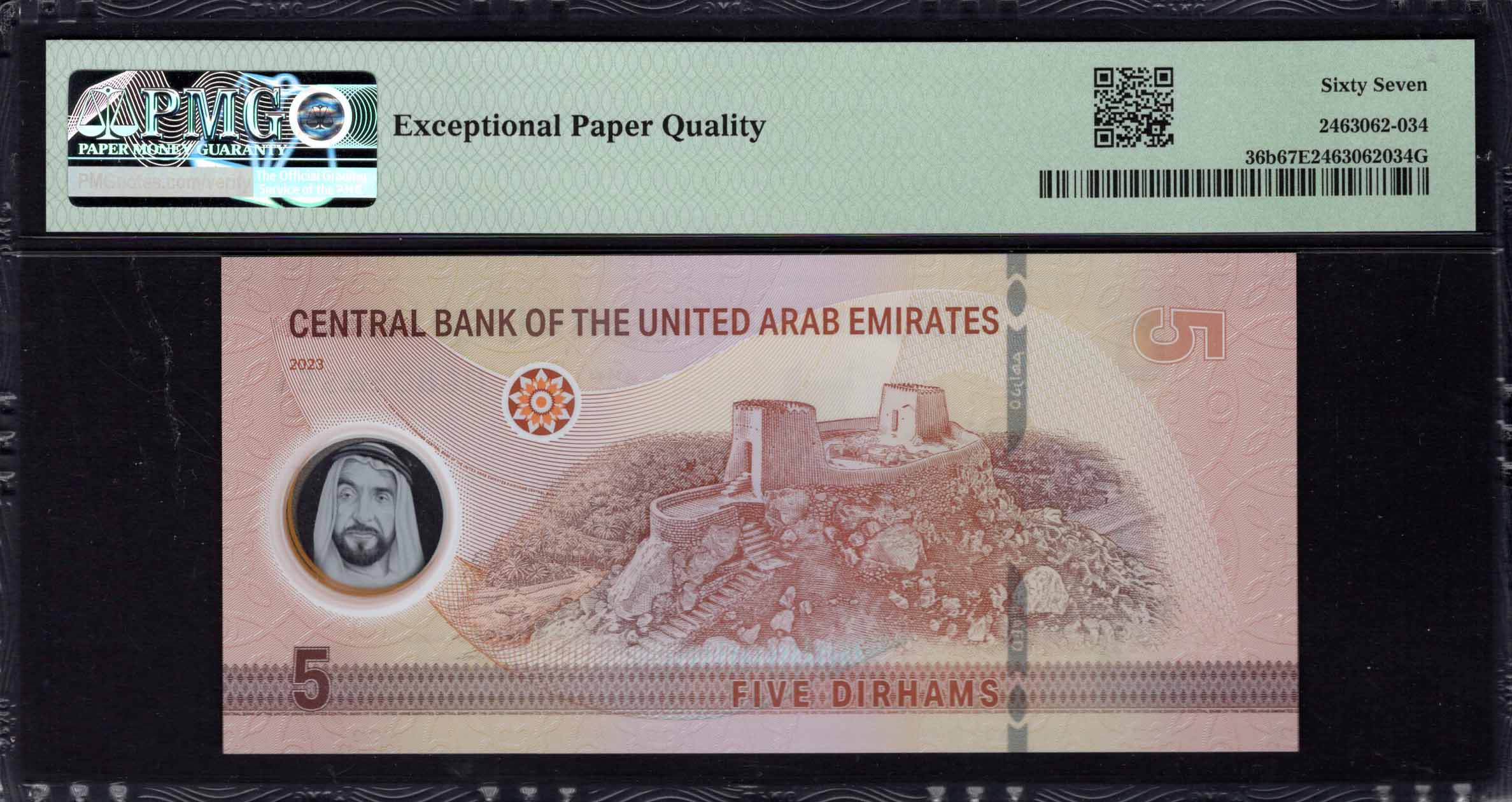 Ce billet, émis par la Banque Centrale des Émirats Arabes Unis, présente des caractéristiques artistiques et de sécurité uniques, typiques des devises modernes. Le recto affiche des couleurs vives, mettant en avant la culture et le patrimoine des Émirats. Une représentation d'un château historique reflète le paysage architectural, symbolisant la force et l'histoire. Des caractéristiques de sécurité telles qu'un hologramme et une micro-impression garantissent l'authenticité du billet. L'utilisation de polymère offre durabilité et une expérience tactile distincte. Au verso, le portrait d'une figure éminente souligne le leadership de la nation.