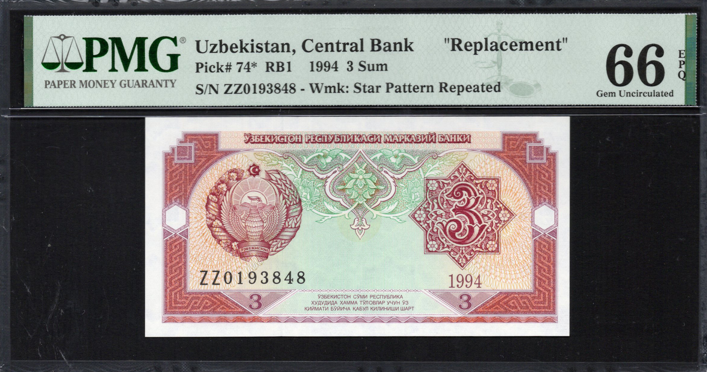Le recto du billet de 3 Sum présente un design richement décoré, affichant en évidence l'emblème de la République d'Ouzbékistan. Dans des teintes de rouge et de vert, le recto montre une combinaison unique de motifs géométriques et de motifs floraux symbolisant le patrimoine culturel de la nation. La zone de filigrane, visible à la lumière, renforce les mesures de sécurité du billet. Le numéro du billet et la dénomination sont clairement indiqués, assurant une reconnaissance facile.