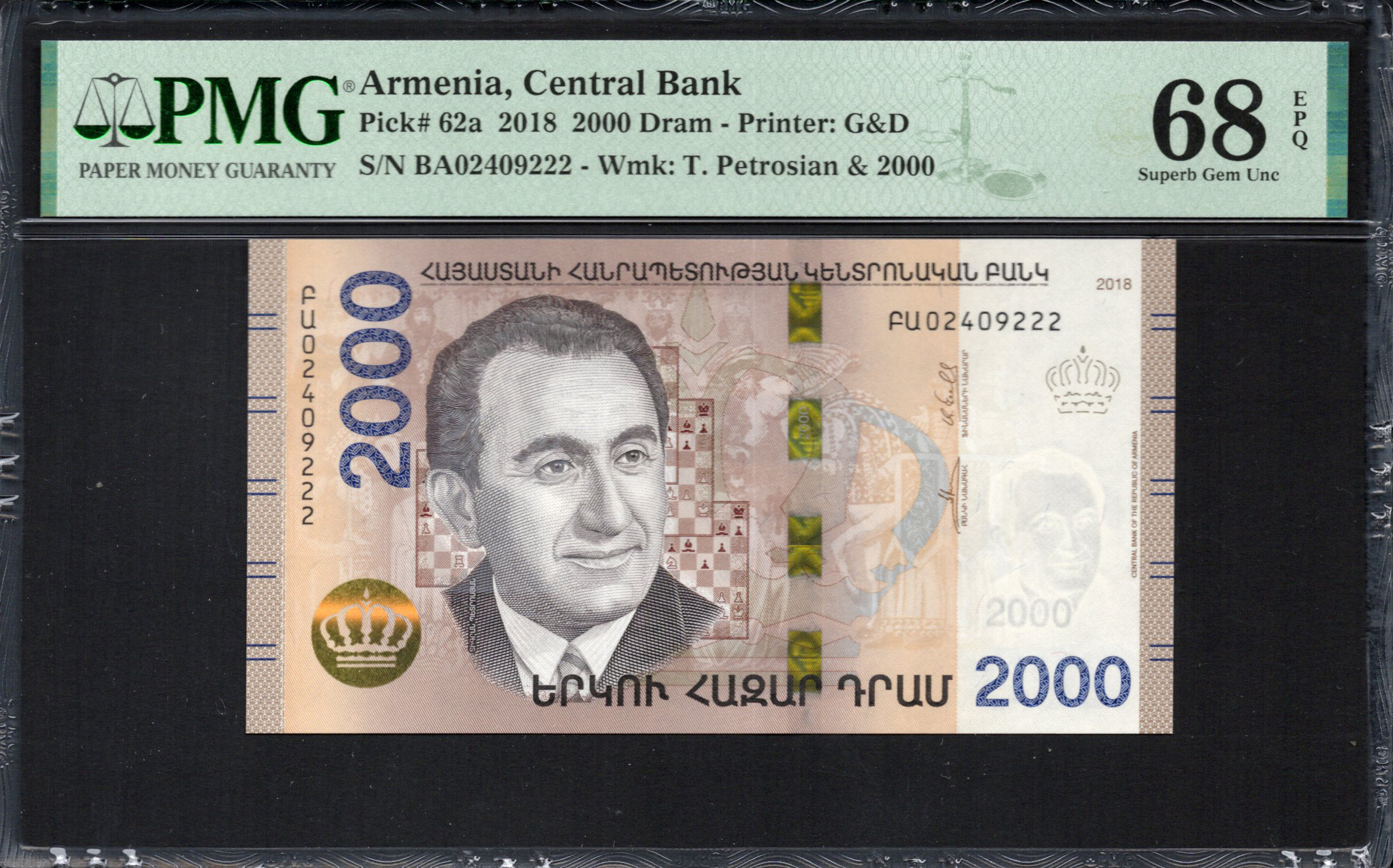 Het 2000 Dram bankbiljet van Armenië combineert historische en moderne designelementen en toont belangrijke persoonlijkheden en culturele symbolen. De voorzijde presenteert een portret van Tigran Petrosian, een gerenommeerde schaker, wat de rijke schaaktraditie van Armenië benadrukt. De ingewikkelde achtergrond bevat schakenpatronen die intellect en strategie symboliseren, terwijl de levendige kleuren de visuele aantrekkingskracht van het bankbiljet vergroten. Met een nominale waarde van 2000 weerspiegelt deze denominatie de toewijding van Armenië aan het eren van zijn nationale identiteit door middel van valuta.