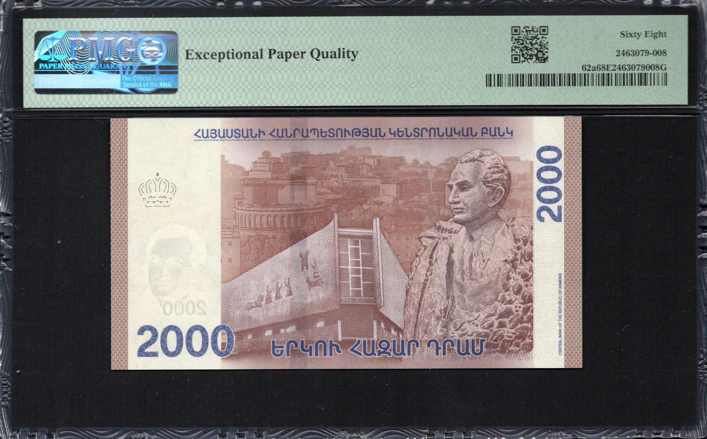 De achterzijde van het biljet toont iconische Armeense architectuur samen met aanvullende schakenmotieven. Deze zijde versterkt het thema van intellectuele bekwaamheid door visuals die de culturele mijlpalen van het land vertegenwoordigen. Het gebruik van zachte kleuren biedt een subtiele maar boeiende contrast met de voorzijde. Opvallend is dat deze zijde elementen van beveiligingsontwerp bevat, zoals latente tekst die verschijnt onder UV-licht, wat ervoor zorgt dat het biljet beschermd is tegen vervalsing. De lay-out, met duidelijk afgedrukte cijfers en een lage reliëf, benadrukt verder de kwaliteit van het vakmanschap van het bankbiljet.