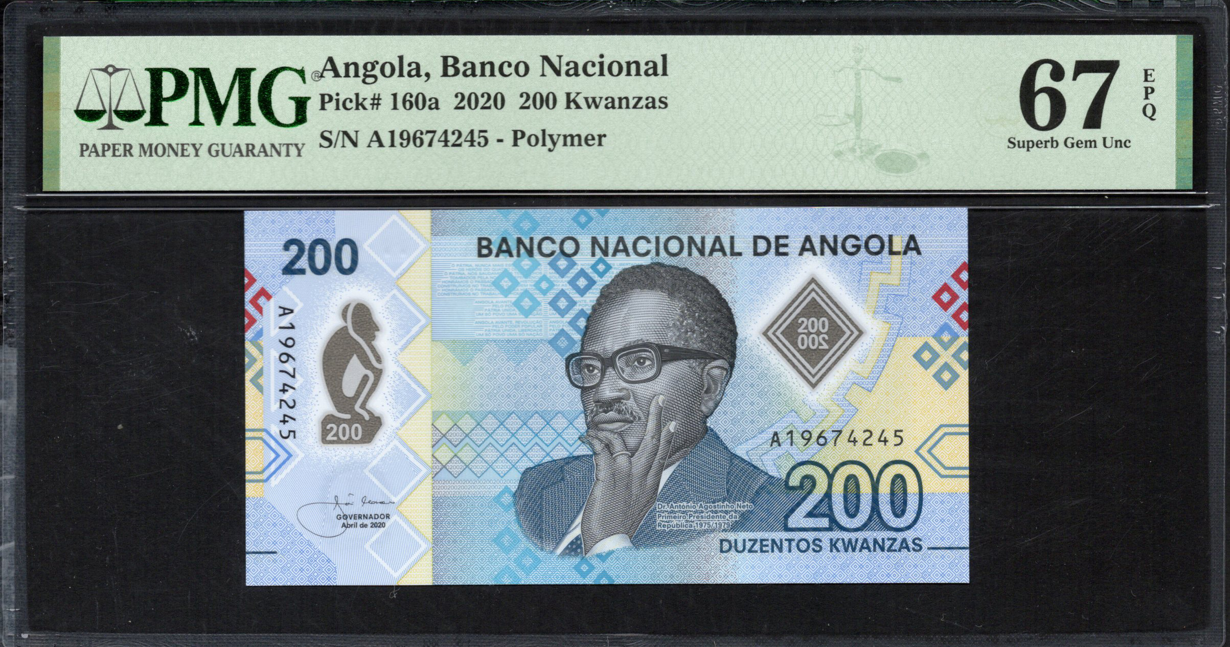 De voorkant van het 200 Kwanza biljet toont prominent een portret, waarschijnlijk van een belangrijke Angolese figuur, dat is gecentreerd tegen een kleurrijke achtergrond. De achtergrond bevat een mix van geometrische patronen in tinten blauw, geel en wit, wat de esthetische aantrekkingskracht vergroot. Opvallende elementen zijn de grote vermelding van de denominatie '200' en de tekst 'BANCO NACIONAL DE ANGOLA.' Opvallende beveiligingskenmerken zijn zichtbaar, zoals een watermerk en mogelijke microprints nabij het portret, die de integriteit van het biljet waarborgen tegen vervalsingen.