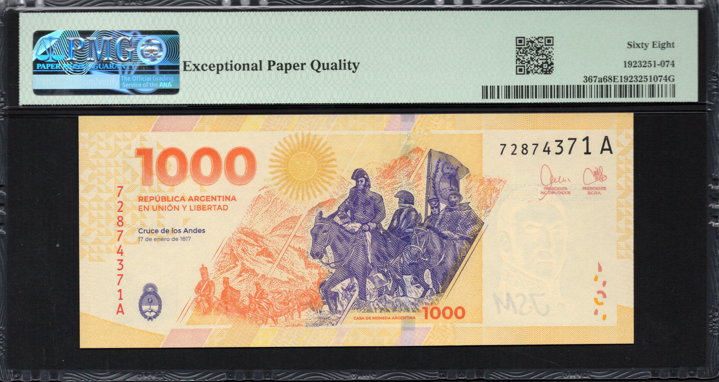 De achterzijde van het 1000 Pesos bankbiljet blijft de culturele rijkdom van Argentinië vieren. Het bevat aanvullende motieven die het ontwerp van de voorzijde echoën, met een harmonieuze mix van kleuren en patronen. De nominale waarde wordt herhaald, wat snelle leesbaarheid waarborgt, terwijl verschillende veiligheidskenmerken, zoals een watermerk en iriserende elementen, aanwezig zijn om vervalsing te ontmoedigen. De achtergrond van het bankbiljet is levendig met ingewikkelde details en artistieke expressies, wat de betekenis van historische figuren en gebeurtenissen in de Argentijnse strijd voor onafhankelijkheid aantoont. Al met al complementeert de achterzijde de voorzijde, waardoor een samenhangend visueel verhaal ontstaat.