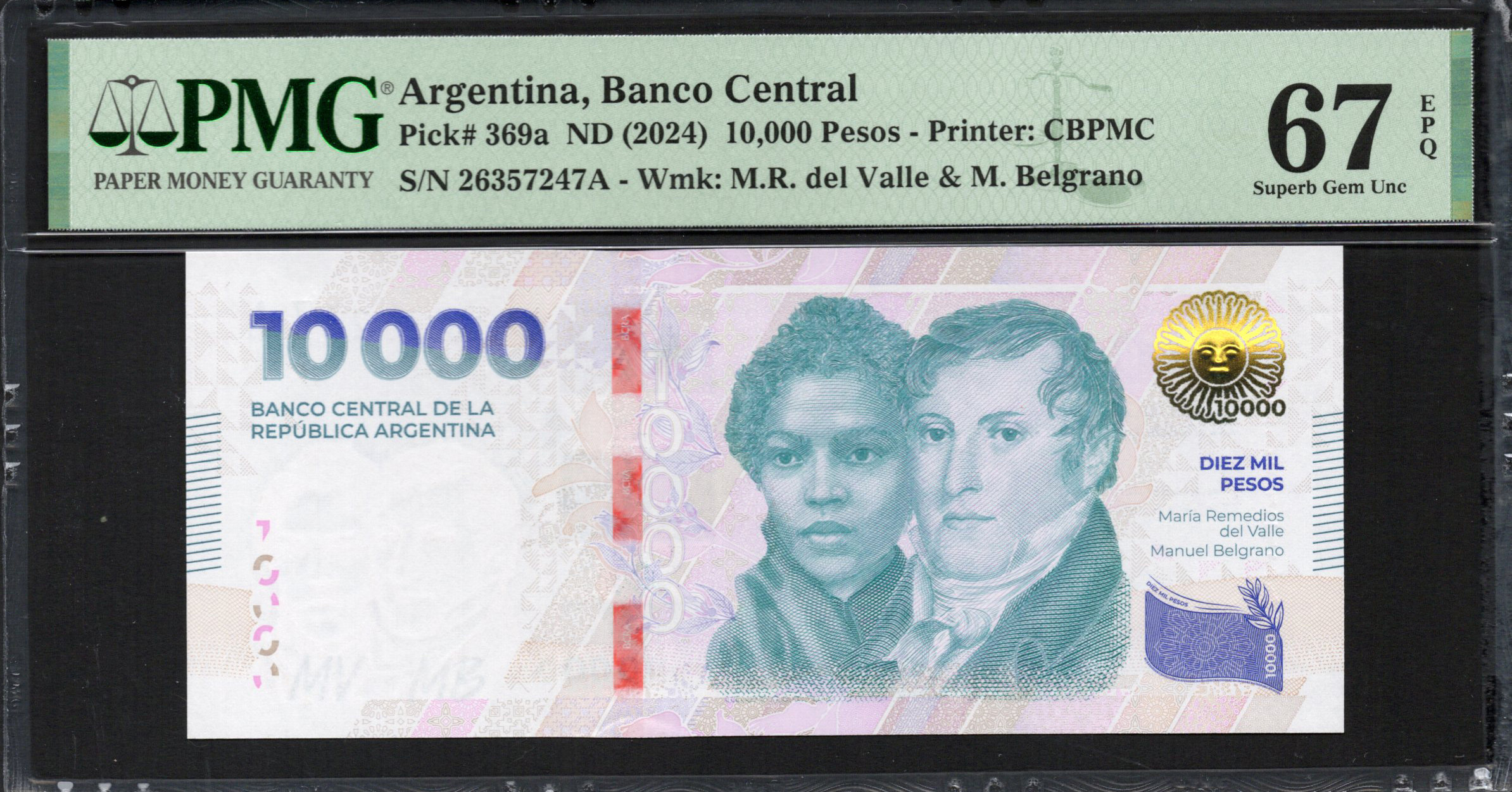 De voorzijde van het 10.000 Pesos-biljet toont levendige kleuren, voornamelijk lichtroze en blauw, met portretten van María Remedios del Valle, een sleutelpersoon in de Argentijnse geschiedenis, en Manuel Belgrano, bekend om zijn bijdragen aan de strijd voor onafhankelijkheid. Het ontwerp bevat verschillende geometrische patronen, wat de visuele aantrekkingskracht vergroot. Veiligheidskenmerken zijn subtiel geïntegreerd, waaronder een watermerk dat zichtbaar is wanneer het biljet tegen het licht wordt gehouden, en microdruk die bijdraagt aan de complexiteit. Daarnaast zijn er rode verticale strepen die helpen bij identificatie.